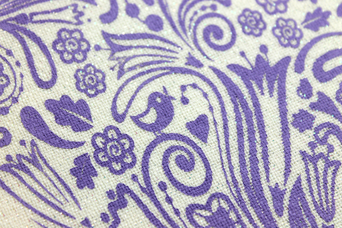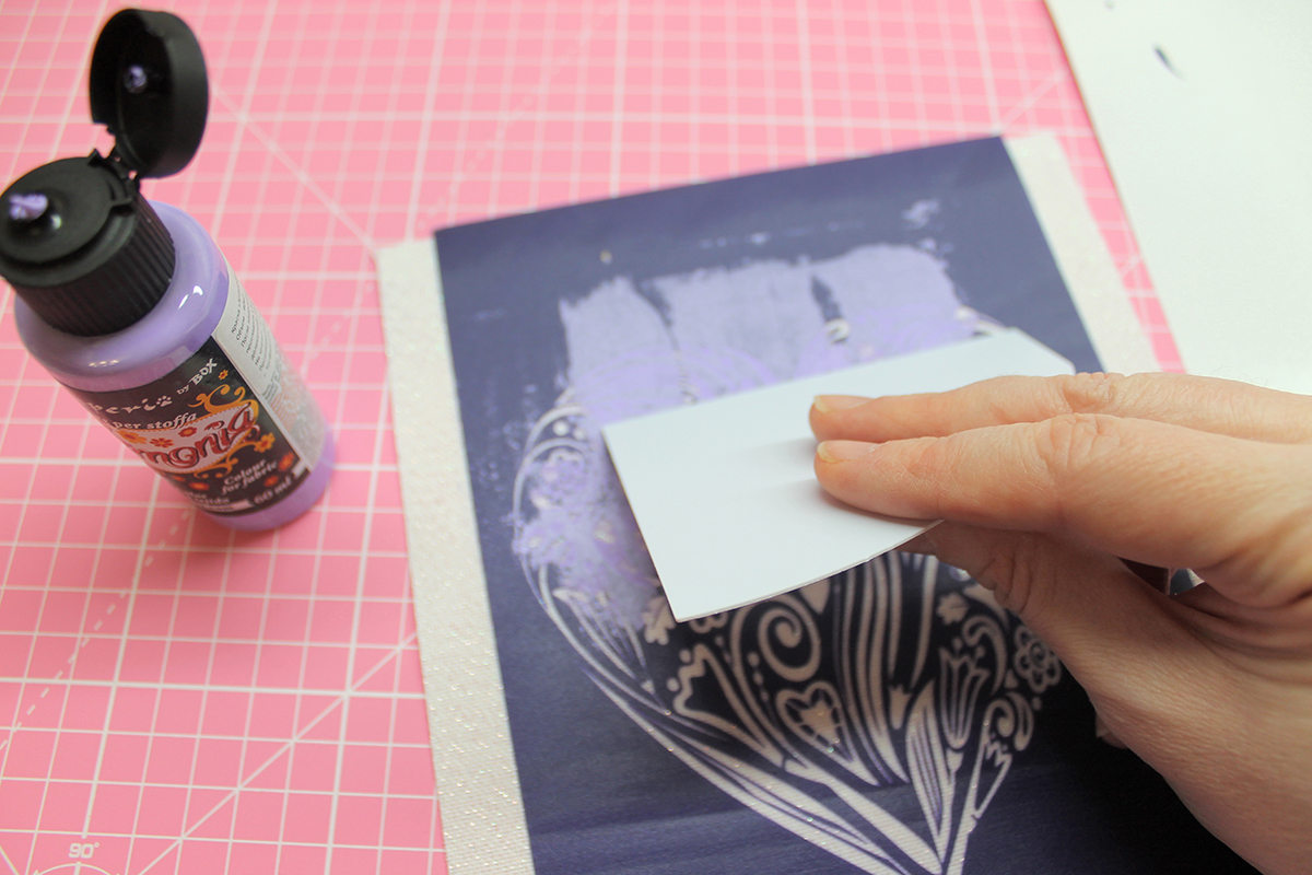 Аккуратно сняла трафарет с подложки и разместила на ткань. Далее краску растянула по трафарету приложенным скребком. Все получилось быстро. После этого трафарет я промыла водой. Но лучше промывать специальным средством. Рисунок идеально лег на ткань! Решаю, как дополнить его вышивкой. Есть идея использовать и нити и бисер!
