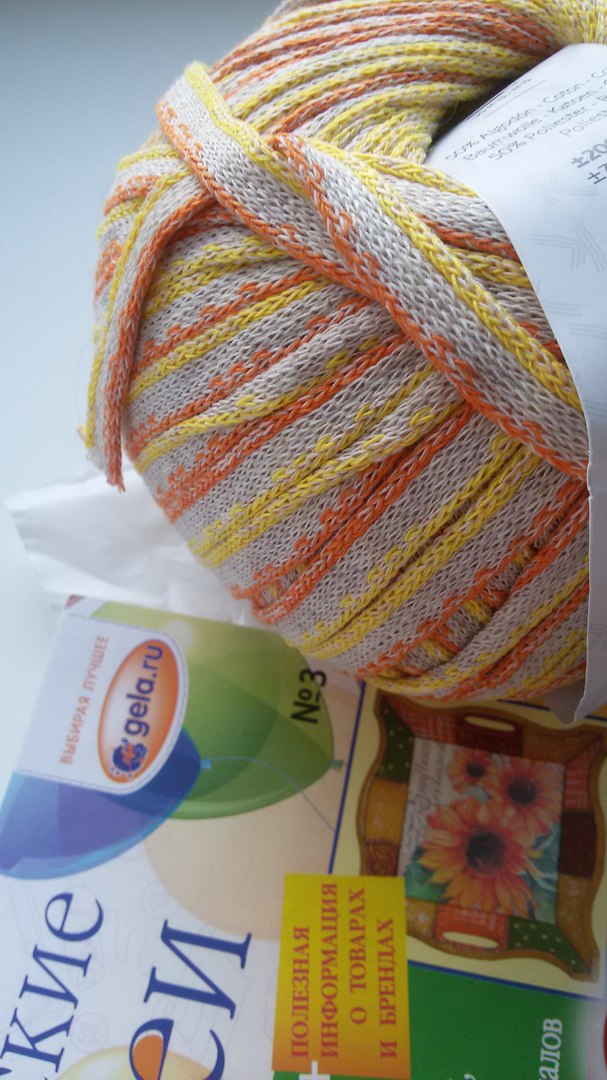 И так пряжа - арт.15084.- 200гр.50% - хлопок 50% - полиэстер. Пряжа невероятная, красивого цвета. Представлена в виде двухслойного трикотажного шнура или ленты ( ширина ~ 7мл. ) светло-серый с переходом по краям жёлтого и рыжего . Тактильно пряжа очень мягкая и приятная. Рекомендовано использовать для работы спицы 12 - 15 или крючок 9 - 10. Но я использовала спицы N 5. Сразу решила, что это будет подушка. При моей плотности вязания полотно получилось очень фактурным и приятным. После отпаривания никаких кординальных изменений не произошло.прекрасно будет держать форму.