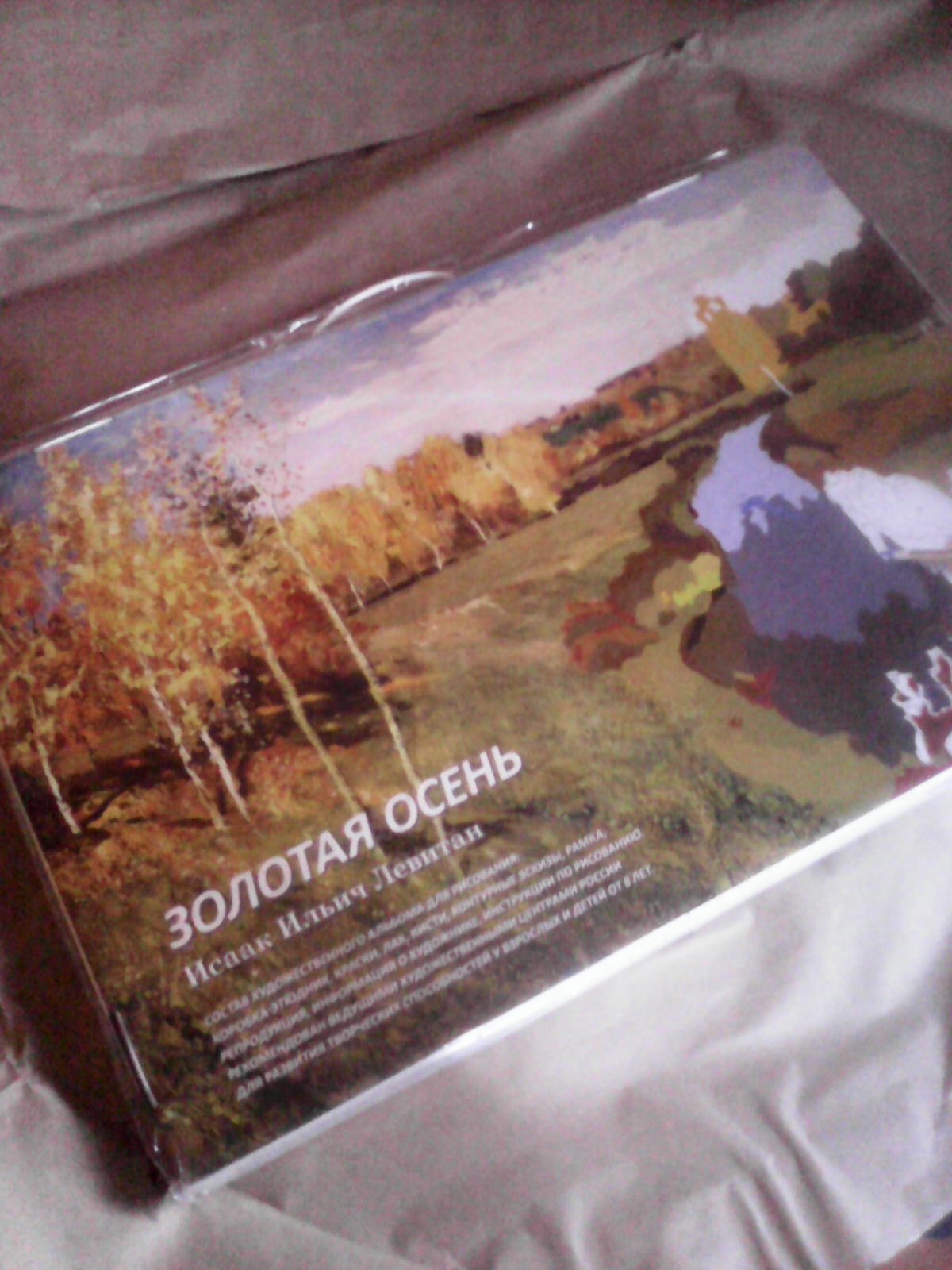 "Золотая осень" Исаака Левитана - милая картина с моим любимым временем года. С помощью этого набора я попытаюсь "стать Левитаном". Итак, что у меня было вначале? Огромная 40*60 картонная раскраска с нанесенными контурами и номерами цветов. 18 цветов акриловой краски на водной основе. 2 кисточки "искусственный колонок" номер 1 и 2, картонная подставка для красок с отверстиями для баночек ( эта подставка кстати напечатана таким образом, что когда открываешь баночки с краской то номер краски оказывается напечатанным вверх ногами, а если эт палитру повернуть так чтобы номер смотрелся правильно, то мешается открытая крышка баночки).Пока это единственный минус который мне встретился. Итак, пользуясь инструкцией я приготовила баночку с водой, салфеточку и все выше перечисленное перед собой на столе и приступила. Надо сказать, что я решила не заморачиваться на мельчайших деталях и раскрашиваю кисточкой потолще все подряд. Это здорово! Сто лет не рисовала и тепрь жалею! Белый фон рождает сизе осенние облака и игривые пятна листьев на их фоне))) еще так мало сделано, и на улице наступает лето, а я наполовину в осени, в ее тихой увядающей красоте)))) Спасибо за чудесное удовольствие производителям))) ну и... обещаю показать результат!