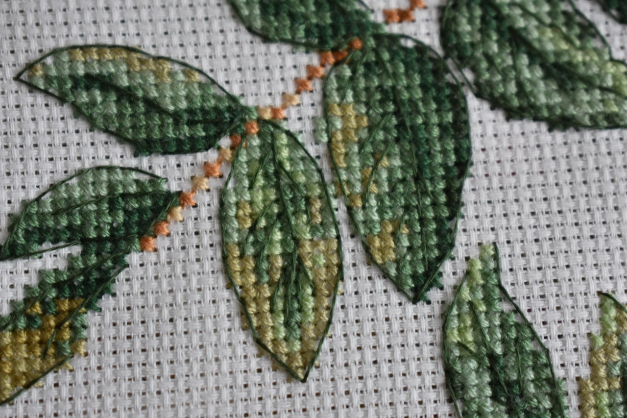 Отдельно хочу написать о контуре. В этой работе контур листиков вышивается одним цветом, а контур птички – двумя. В результате в одних местах он сливается с крестиками, а в других - уж очень сильно выделяется. Я думаю, будет естественнее смотреться, если сделать контур нитками нескольких цветов, плавно переходящих друг в друга.