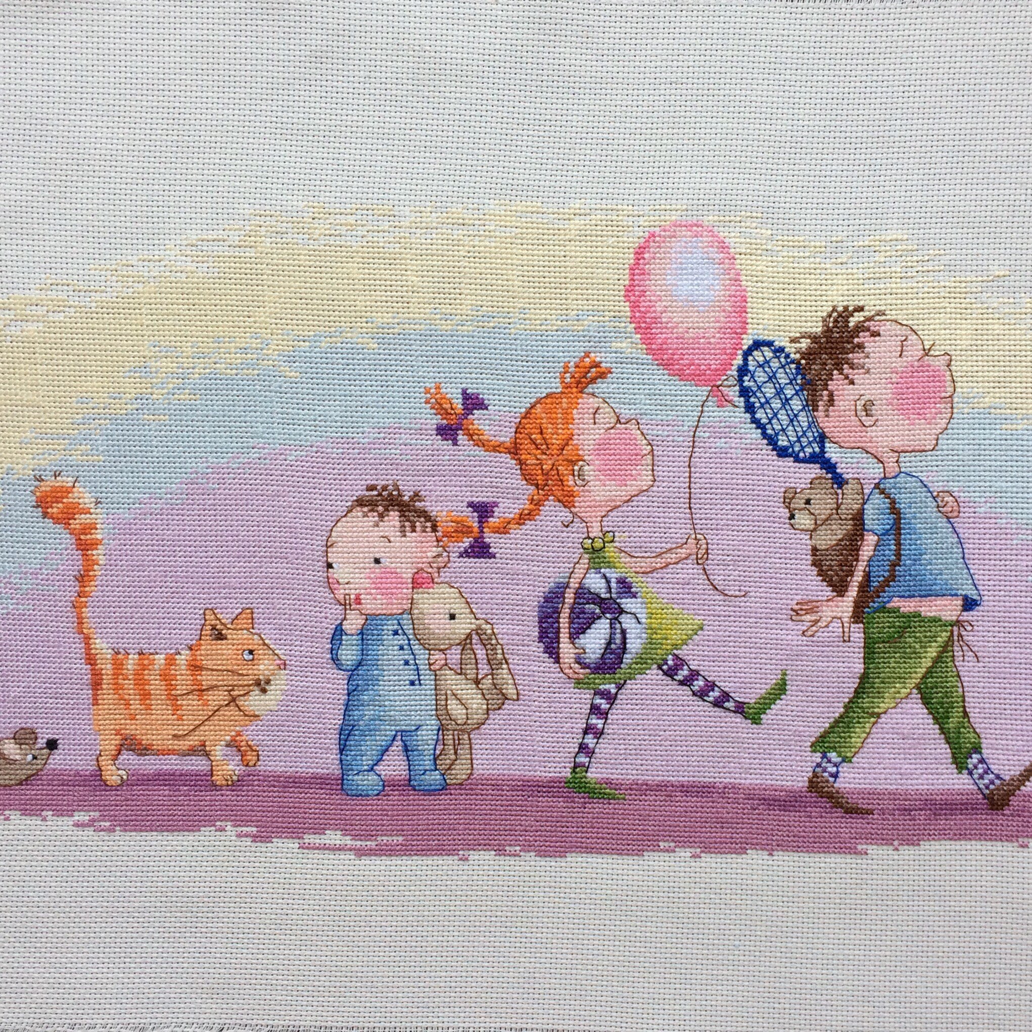От процесса вышивания я получила огромное удовольствие. Работа получилась очень яркая и позитивная ! Размер готовый работы вышел 38 на 25 см. И я уже знаю кому ее подарю после оформления в багетной мастерской . Забавные персонажи очень похожи на детей моего брата . Количество , возраст и пол все совпало с картинкой . Этим набор и привлек к себе мое внимание . Надеюсь им понравится мой подарок .