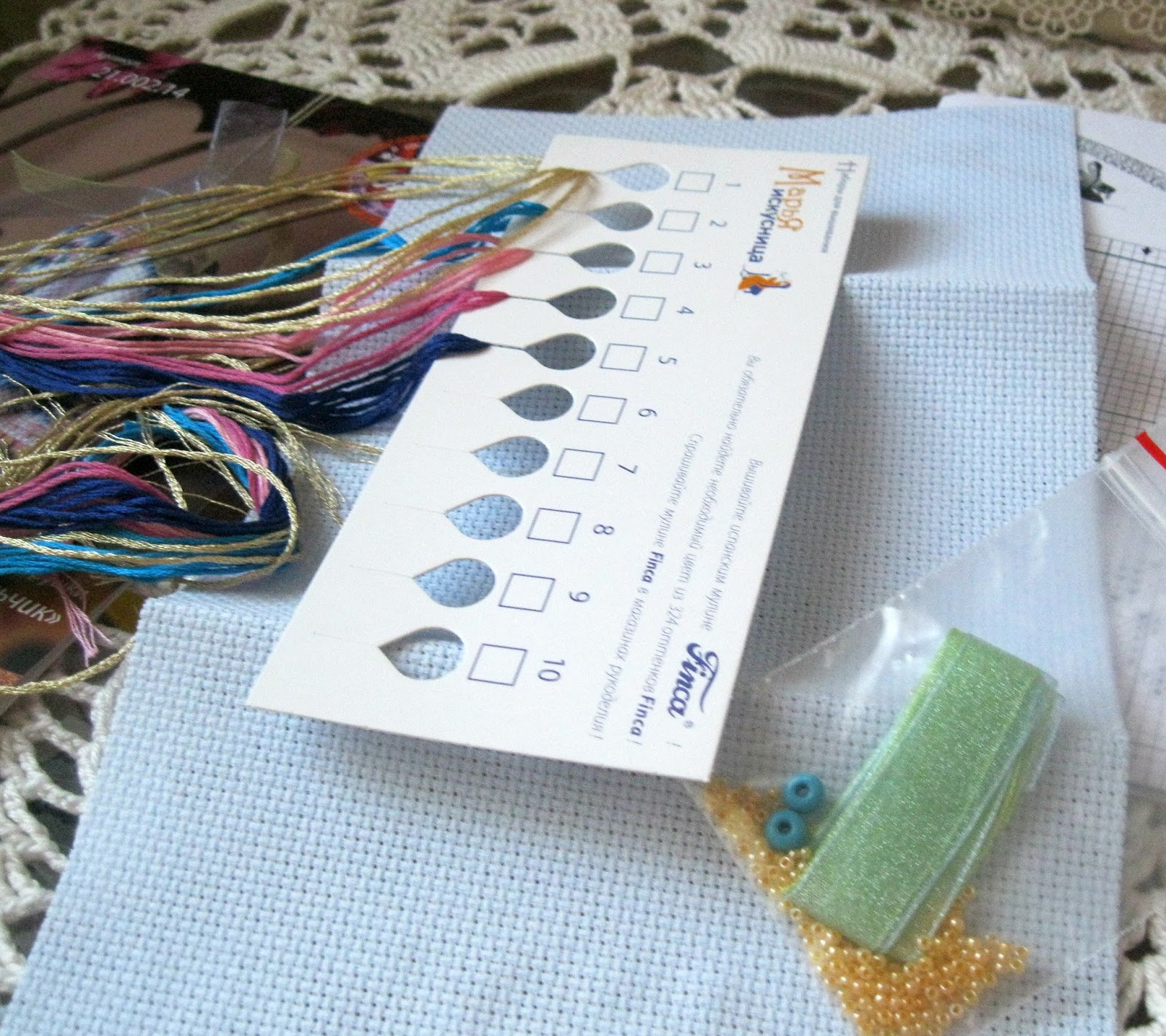 В набор входит мулине финка,финка и металлик,две нежные ленточки из органзы,бисер,две бусины,канва Zwaigart очень красивого серо-голубого оттенка и иголочка.Рассмотрим эти материалы поподробней:
