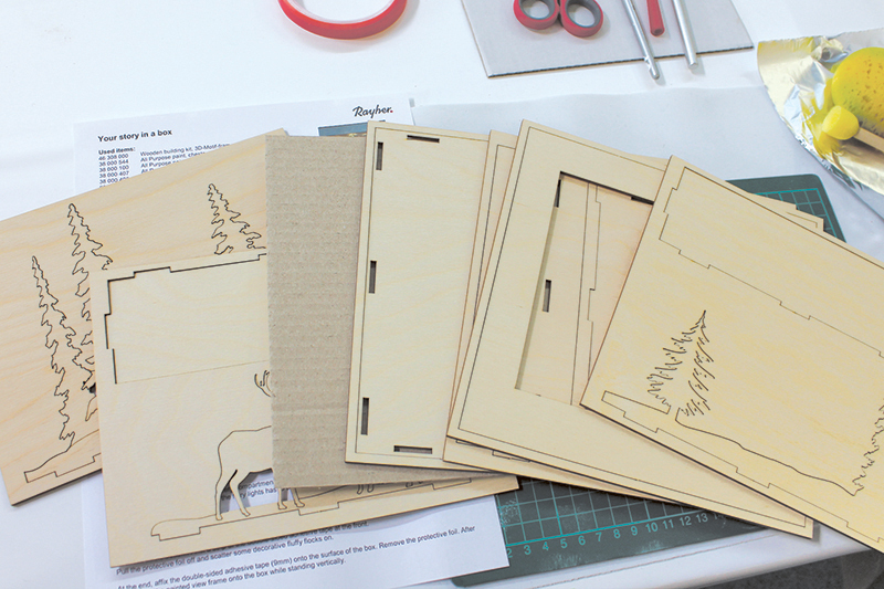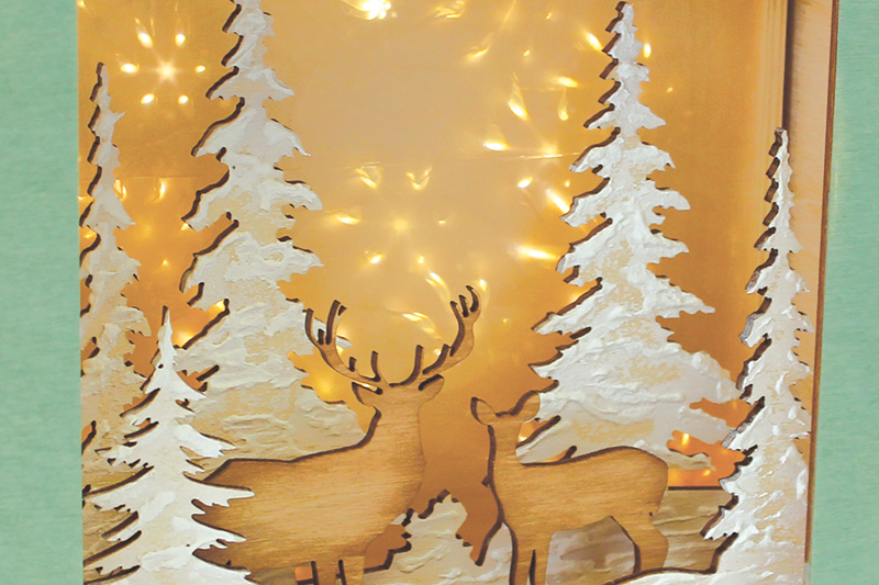 4. Устанавливаем все внутренние детали на платформу с отверстиями. Первый уровень - фоновые елочки, второй - олени, третий - боковые елочки.
