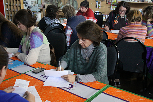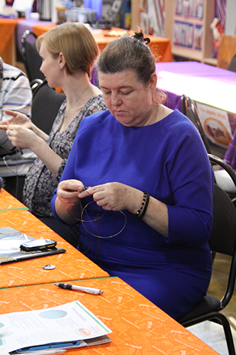 На мастер классе по изготовлению великолепной броши можно было попробовать вязать и спицами из оливкого дерева и крючками