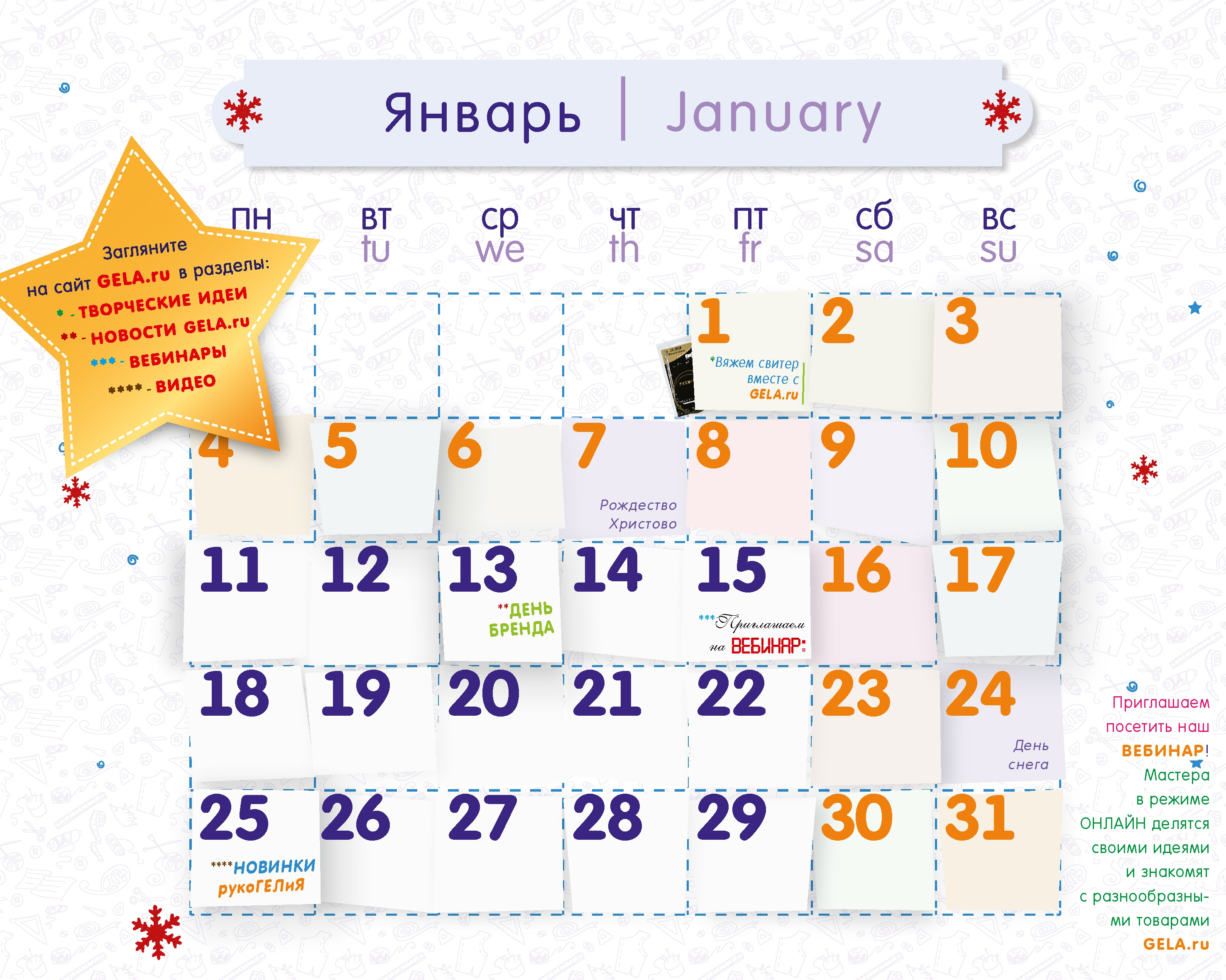Наверняка, у каждой рукодельницы есть свой творческий уголок и GELA.ru спешит привнести еще больше уюта в него своим настенным «ХОББИ-Календарем» на 2016 год! Это уникальное издание компании GELA.ru! Каждый месяц вы можете знакомиться с разными видами современного хобби и рукоделия, любоваться рукодельным шедевром от российских мастеров и при желании научиться делать подобные вещицы самим! С помощью календаря вы также сможете фиксировать важные события, в том числе и творческого характера!