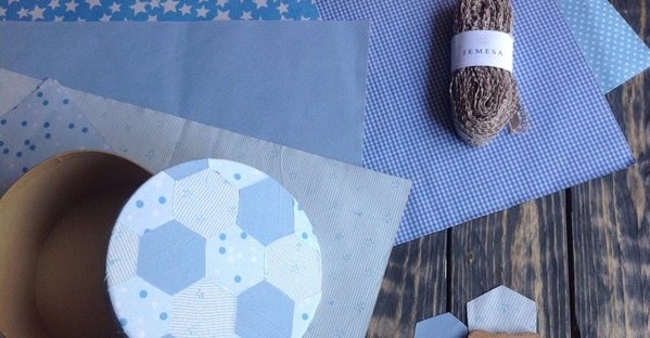 Если ткань обычная, то сначала из нее нужно будет сделать "самоклеящуюся" с помощью двухстороннего скотча. Наклейте на него кусочек хлопковой ткани. Проследите, чтобы не было заломов, разровняйте, прикладывайте изнаночную сторону ткани к липкому слою скотча, защитную пленку не снимайте. Когда сделаете достаточно заготовок начинайте выкраивать шестиугольники.