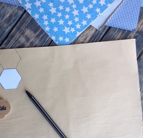 1. Если у вас, как у меня, ткань на липкой основе, то на обороте начинайте делать выкройки шестиугольников. Просто прикладывая их к ткани обводите карандашом.