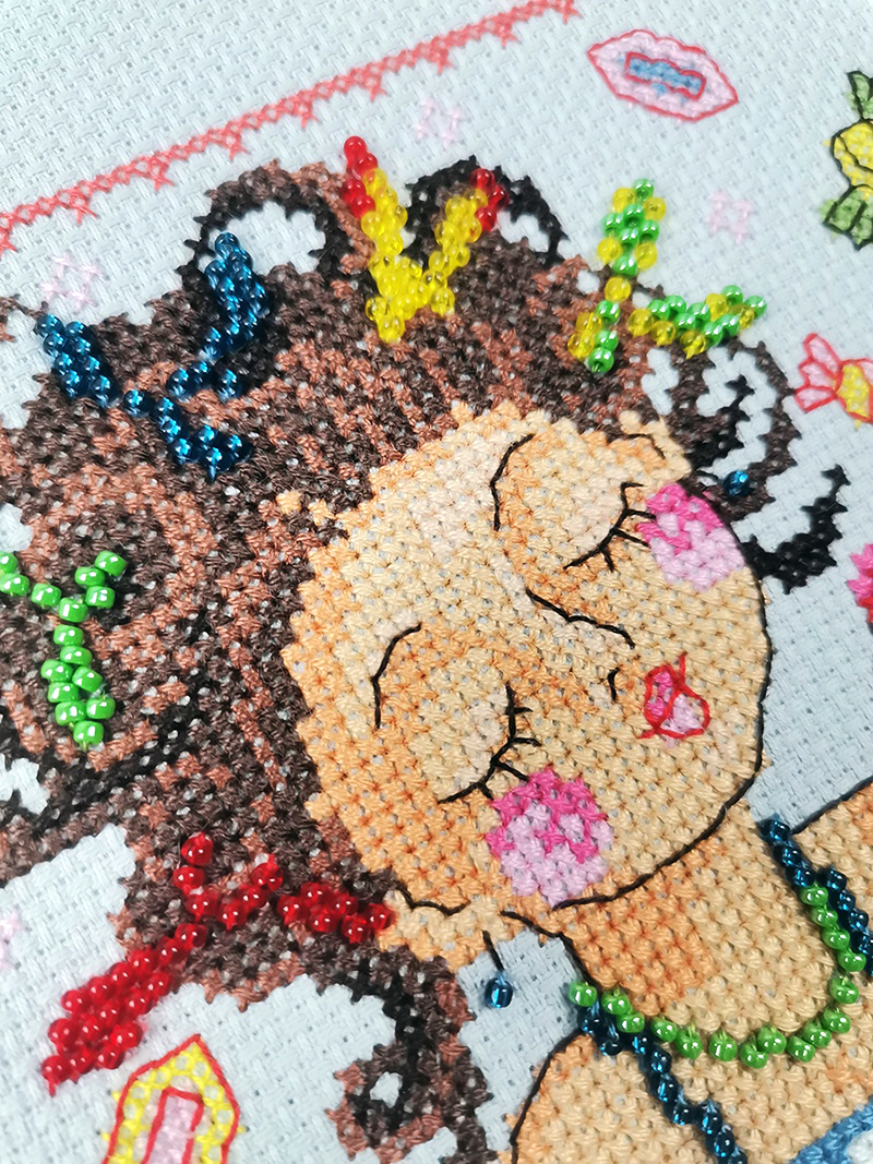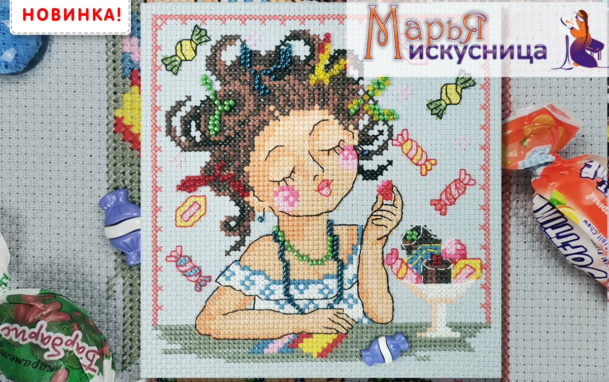 Набор для вышивания "Сластена". В сюжете забавная девчушка в окружении сладостей и конфет.