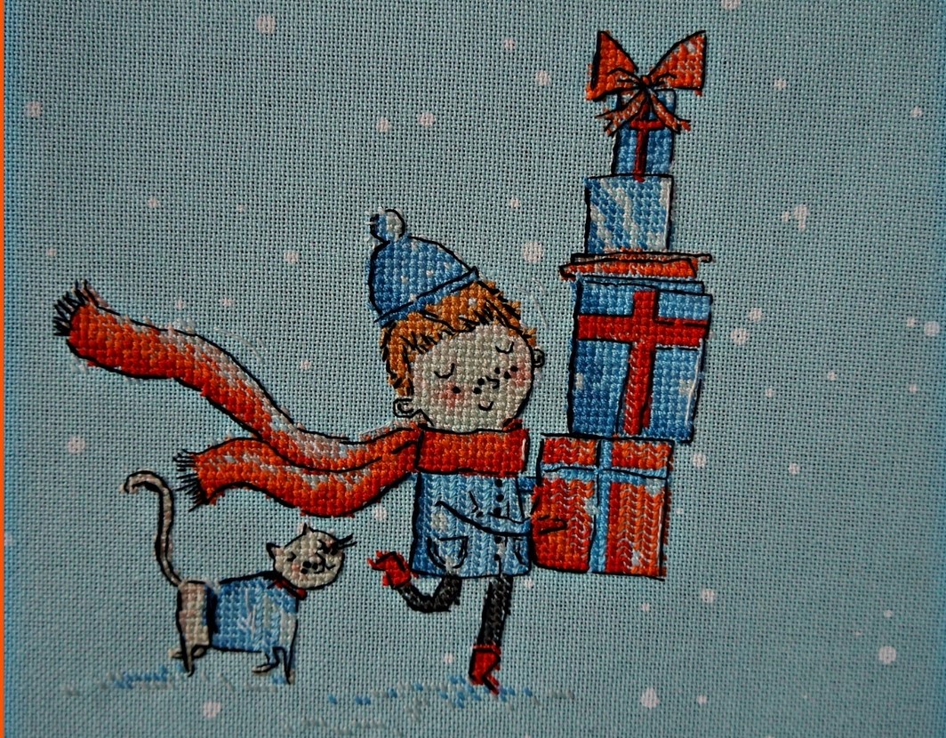 И я оказалась среди тех счастливчиков! Мне прислали основу нежно-голубого цвета в изящную белую крапинку (цвет 5429) размером 35 на 35 см. Я решила, что буду вышивать схему Светланы Немирицкой "Новогодняя с котом". Посмотрите, как круто смотрятся зимние сюжеты на этой основе! Эти крапинки, как настоящие пушистые снежинки, падающие на землю и на мальчика, который несет новогодние подарки. И на котейку, с важным видом шагающего рядом. Крапинки расположены хаотично на основе, поэтому создается ощущение настоящего снегопада. Раньше на основах от Zweigart все крапинки были нанесены ровными линиями, что немного смущало, но теперь у вышивальщиц есть основа с настоящим падающим снежком!