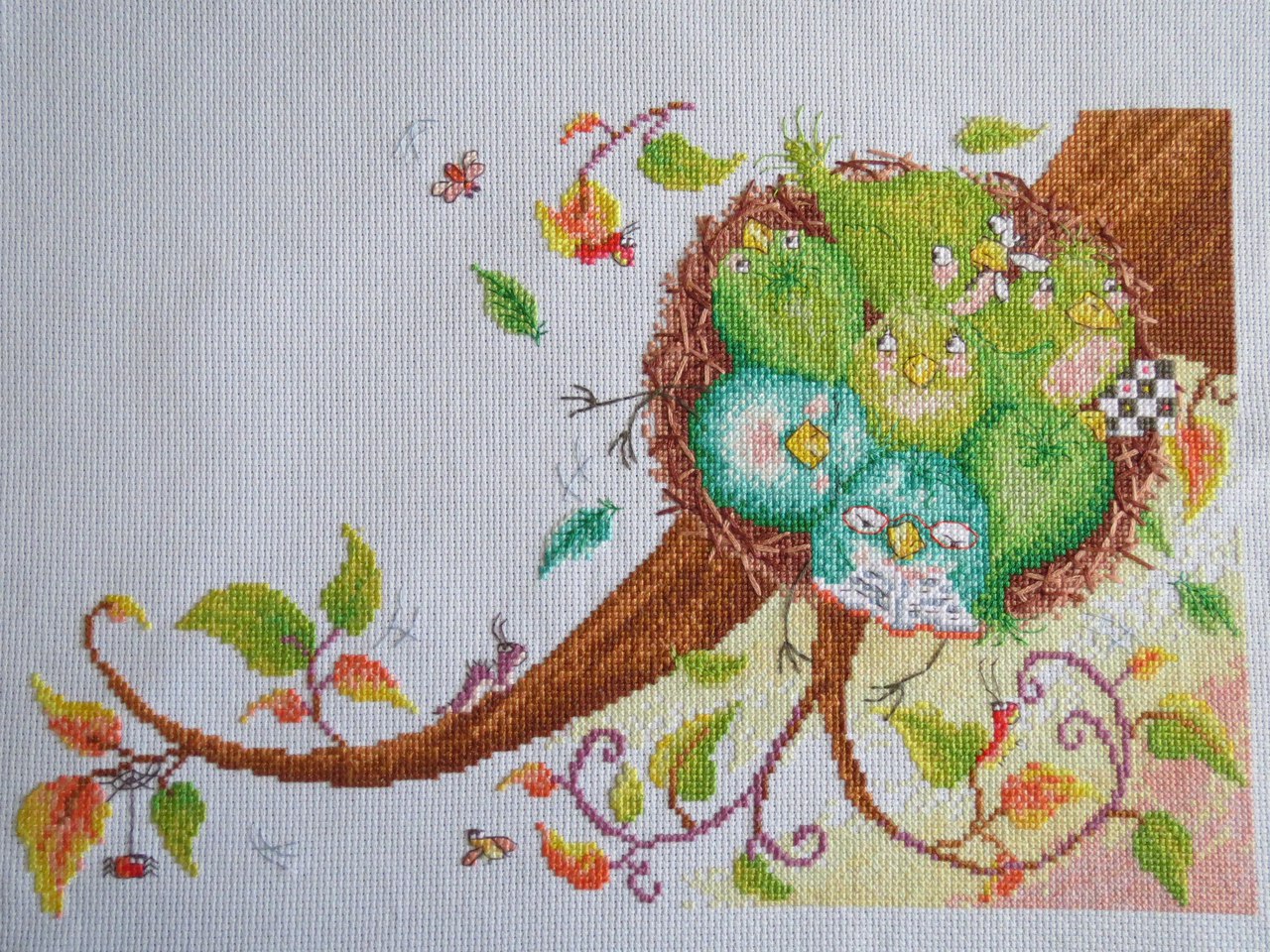 Ну вот и готово уютное гнездышко, милые птички, такие пушистые и милые, расселись по местам. Такая замечательная семейка получилась, прямо солнечная! Хочу поблагодарить компанию gela.ru за возможность познакомиться с набором (арт. 15.001.24) торговой марки «Марья-Искусница». По окончании работы могу подвести итоги)). В целом набор очень понравился: качественные материалы и иголка, удобный органайзер для ниток, крупная черно-белая схема. Но кое-что подпортило мое впечатление: мне крестиков на 30 не хватило ниток одного цвета (средний цвет корицы №34) для гнезда, пришлось импровизировать — в итоге, этого никто не заметит). Светлого и темного цвета корицы (№33 и №34) хватило, но впритык. Покупая этот набор в реальном магазине, проверьте, сколько пасм этих ниток на планшетке, выберите тот набор, где их побольше, лучше по 3))), а в Интернет-магазине, попросите оператора проверить комплектацию перед отправкой.