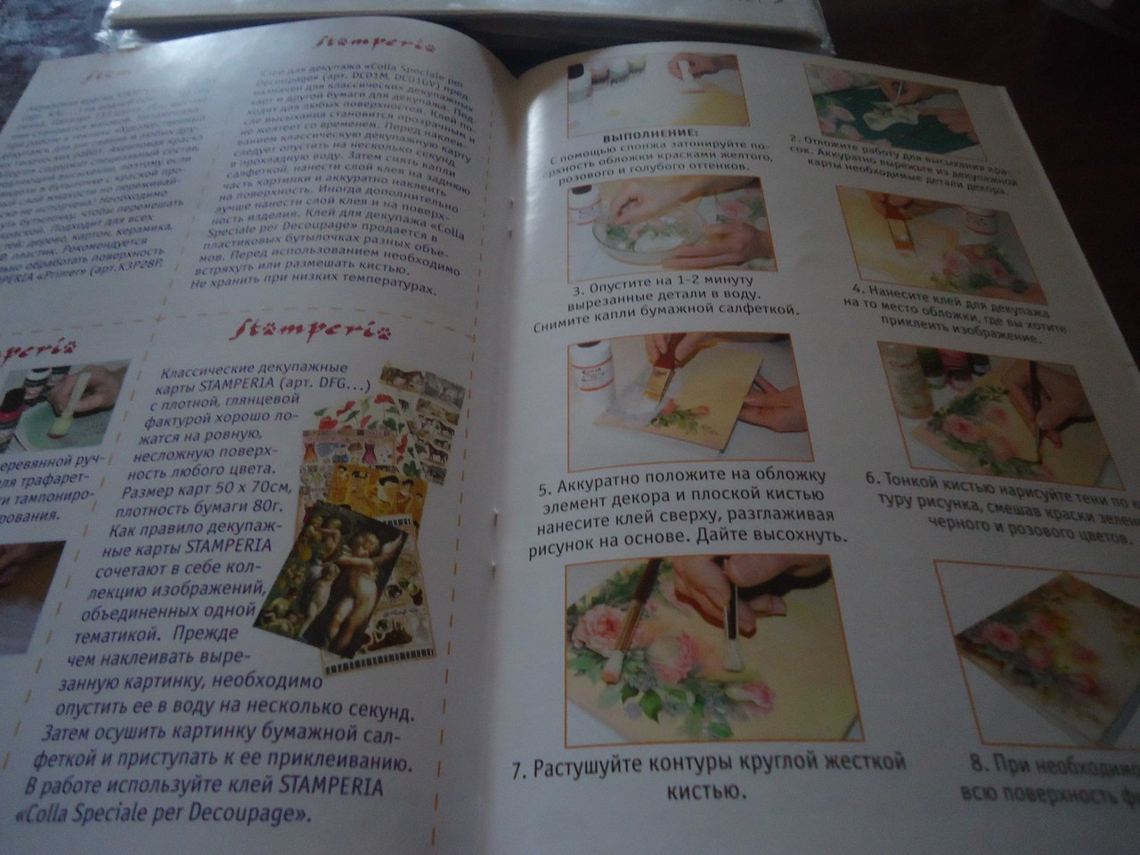 Из рекламы там вставлено по странице именно тех материалов, которые используются в поделках и производятся разными брендами (Gela, Hemline, Stamperia и т. д.). Предложено их совсем отрезать, но я решила, что жаль терять эти краткие описания, и просто завернула каждый на середине, что как раз не мешает совмещать ключевую картинку поделки с описанием, а даже служит своеобразной закладкой