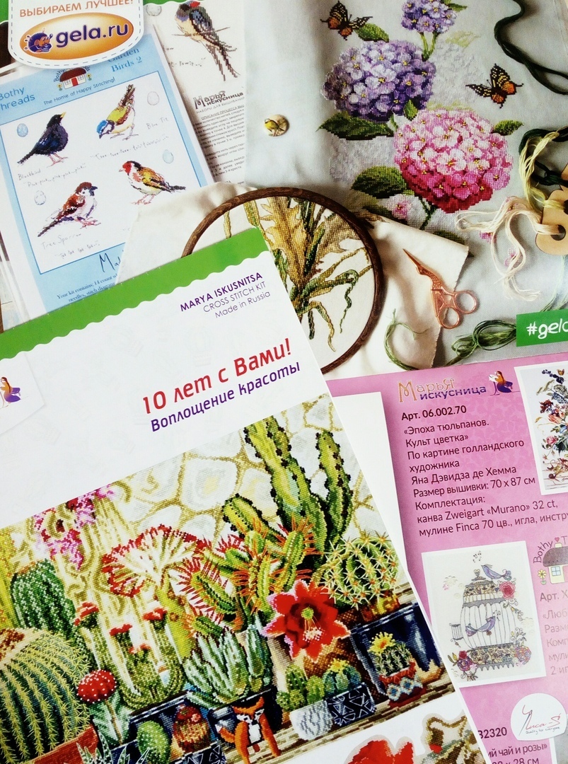 Кроме канвы в посылке оказались еще и приятные подарки: брелок от ZWEIGART, креативный календарь от GELA.ru, о котором я очень мечтала после видео с формулы рукоделия и буклет с новинками и схемой для вышивки от Марья Искусница! Больше всего из каталога понравились гортензии, они великолепно проработаны.