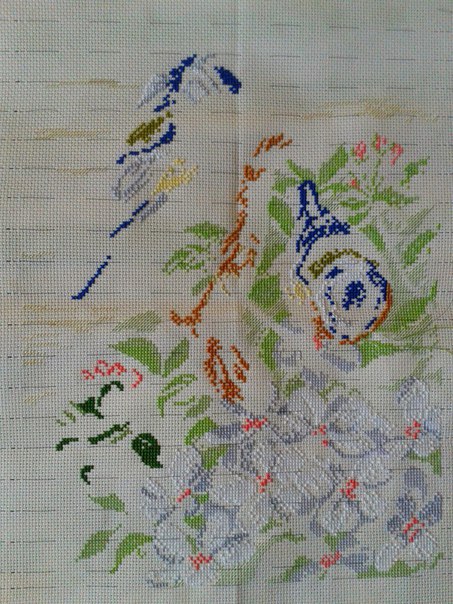 Размер готовой работы 22х30 см. Картина вышивается крестом и полукрестом в 1 и 2 нити, также присутствует немного бэкстича и несколько французских узелков.