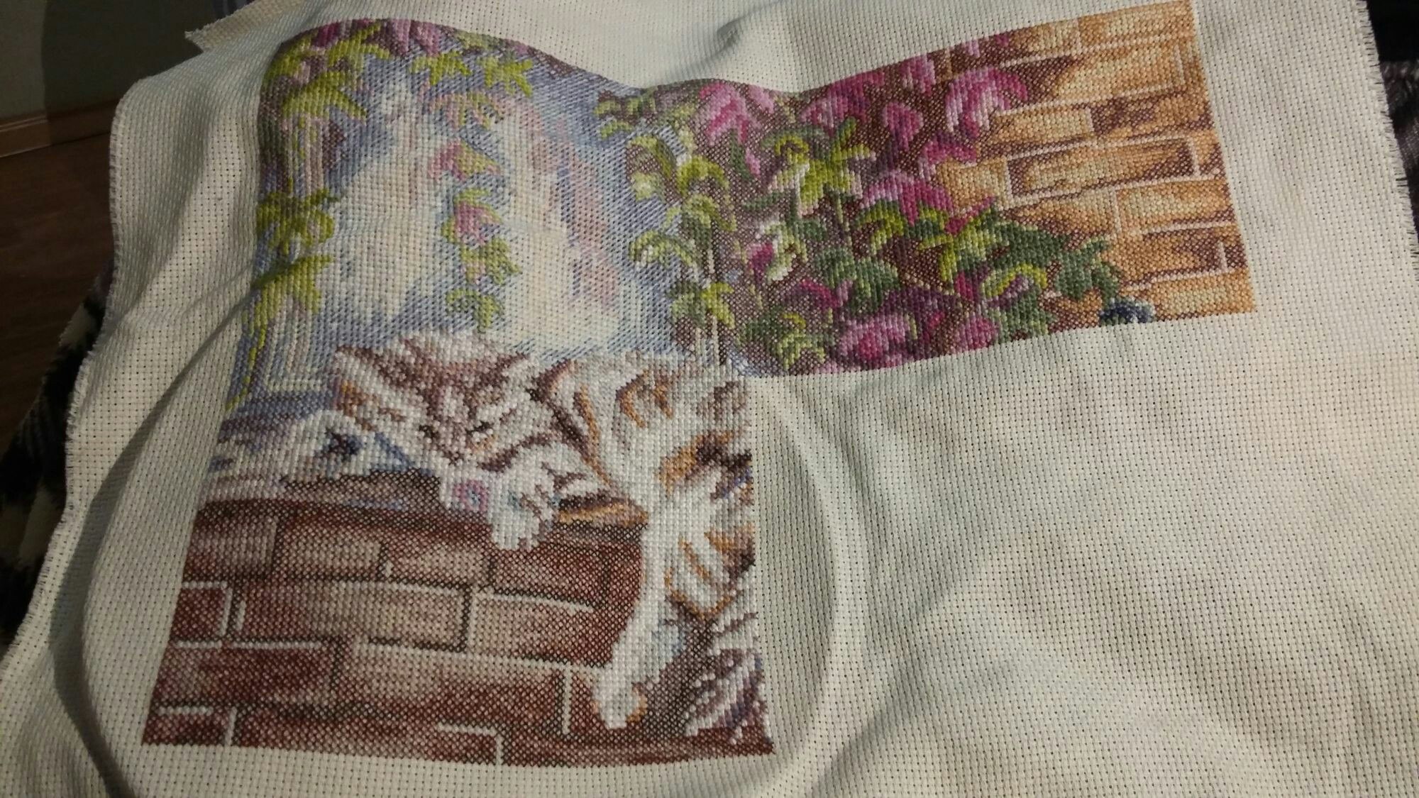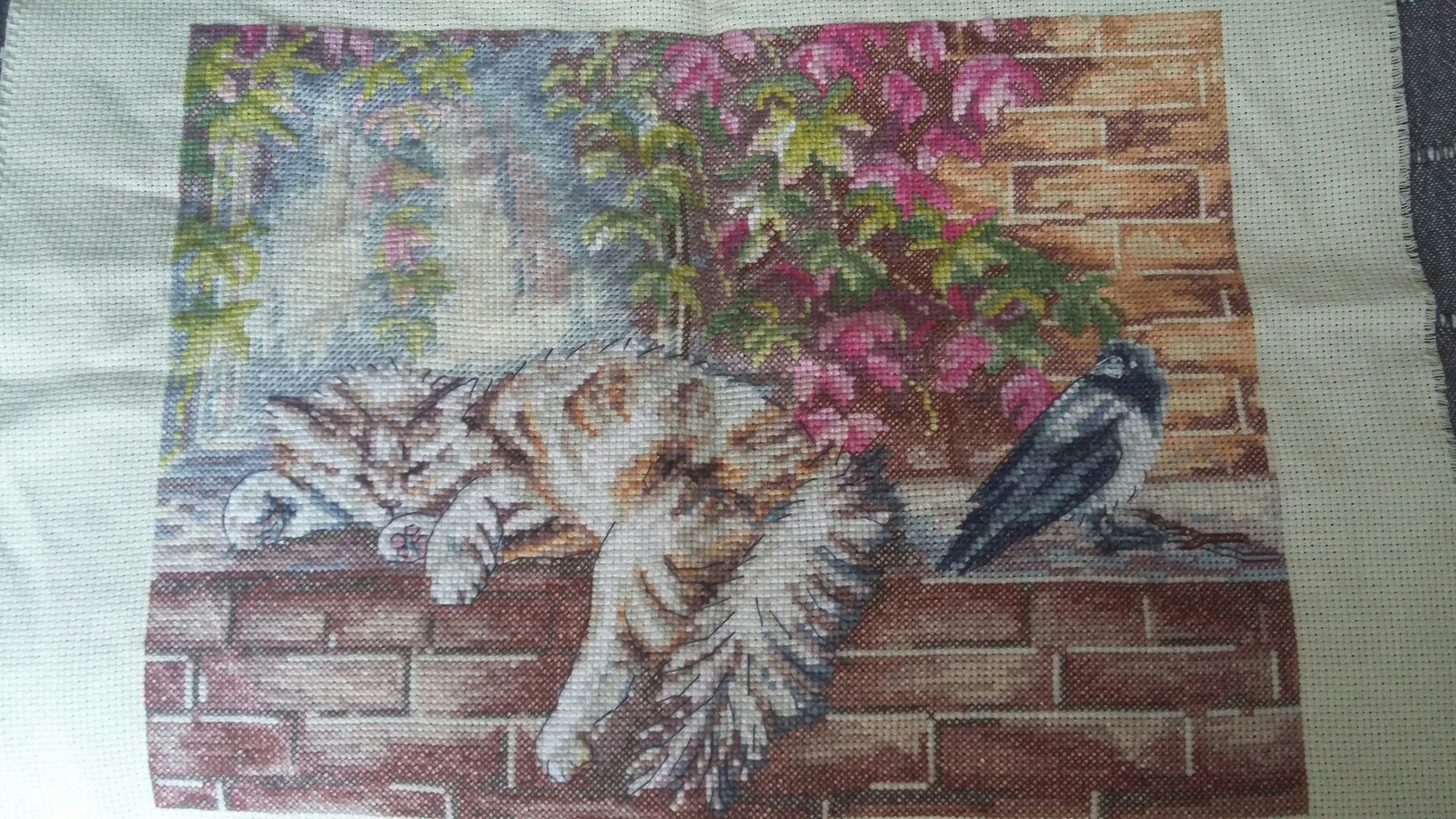 И знаете, лишь в момент, когда я начала шить этот набор, когда появлялись по-тихоньку прищур кота, клюв вороны, цветы растения и блики на стеклах, я смогла дать себе отчет в том, что действительно притягивает в этом сюжете. Безмятежность. Я бы даже сказала гармония безмятежности животного и смелость и уверенность птицы. Уверенность и смелость птицы, которая, будучи априори более слабым существом не робеет…не боится… Она просто стремится к своей цели. С осторожностью, да, но абсолютно зная, что ей нужно – утеплить свое гнездо. Так и кажется, что она сейчас посмотрит на тебя и скажет – «Вы знаете, натуральные материалы, самые качественные, уж я то в этом знаю толк, не хотите помочь? Я с вами поделюсь клоком, хотя бы подержите кота, чтоб наверняка) Ну, пожалуйста)»