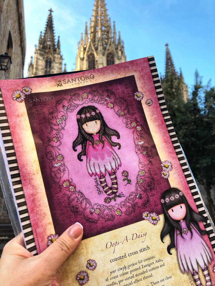 OOPS-A-DAISY" , который был предоставлен мне на тест gela_ru Этот набор был разработан по рисунку шотландской художницы Сьюзан Вулкот (Suzanne Woolcott). Сьюзан придумывает таких милых и мечтательных девочек по имени Gorjuss посмотрев на неё, я решила, что такая романтичная девчушка заслуживает поездку в чудесную Барселону, и первые стежки сделала там же!!! Итак , давайте перейдем к комплектации набора. В его состав входит: