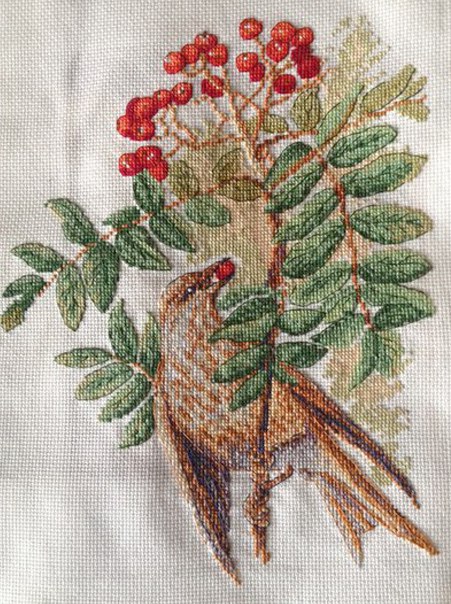 Пару месяцев назад, я решила принять участие в тестовом отшиве наборов фирмы Марья искусница. Связалась с представителем компании и через пару дней получила свой первый набор для работы. Это была вышивка по рисунку Эдит Холден "Ветка рябины". В тестовом наборе, практически как и в стандартных наборах находиться канва(Aida 16), нитки мулине # Finca, разобранные на стандартный органайзер фирмы, иголка, схема на четырех листах, и лист с описанием цветов, но в отличии от уже запущенных в производство наборов, в описании содержаться стандартные номера мулине Finca и количество выполняемых крестиков и стежков каждым цветом, количество расходуемых ниток и вложенных в набор. В моей работе над вышивкой необходимо было посмотреть хватит ли для работы вложенных материалов, как отпечатаны значки схемы, сочитание цветов. Скажу сразу, когда увидела сначала картинку вышивки, была немного разочарована, как то показалась она мне не впечатляющей, но приступив к работе поняла что не могу оторваться от неё. Стежок к стежку и сложилась замечательная картина, заигравшая яркими оттенками красного в изображении рябины, зелеными в листьях, коричневыми и охровыми для птицы. А в заключении выполнив стежки бека глаз от работы было не оторвать. Вложенных в набор ниток мулине оказалось более чем достаточно. Вся работа, по времени выполнения заняла около двух недель(садилась вечером после работы на пару часов). Надеюсь что в скором времени ассортимент фирмы Марьи искусницы пополниться набором "Ветка рябины" по картине Холден Эдит.