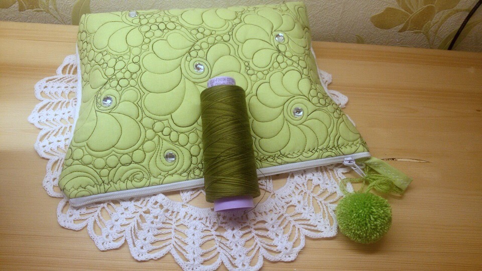 Я шила косметичку на промышленной машине Аврора А8601, поэтому не могу оценить, как поведет себя нитка, заправленная в бытовую машину. В моей работе нитка осталась целой на протяжении всего пошива, не скручивалась.