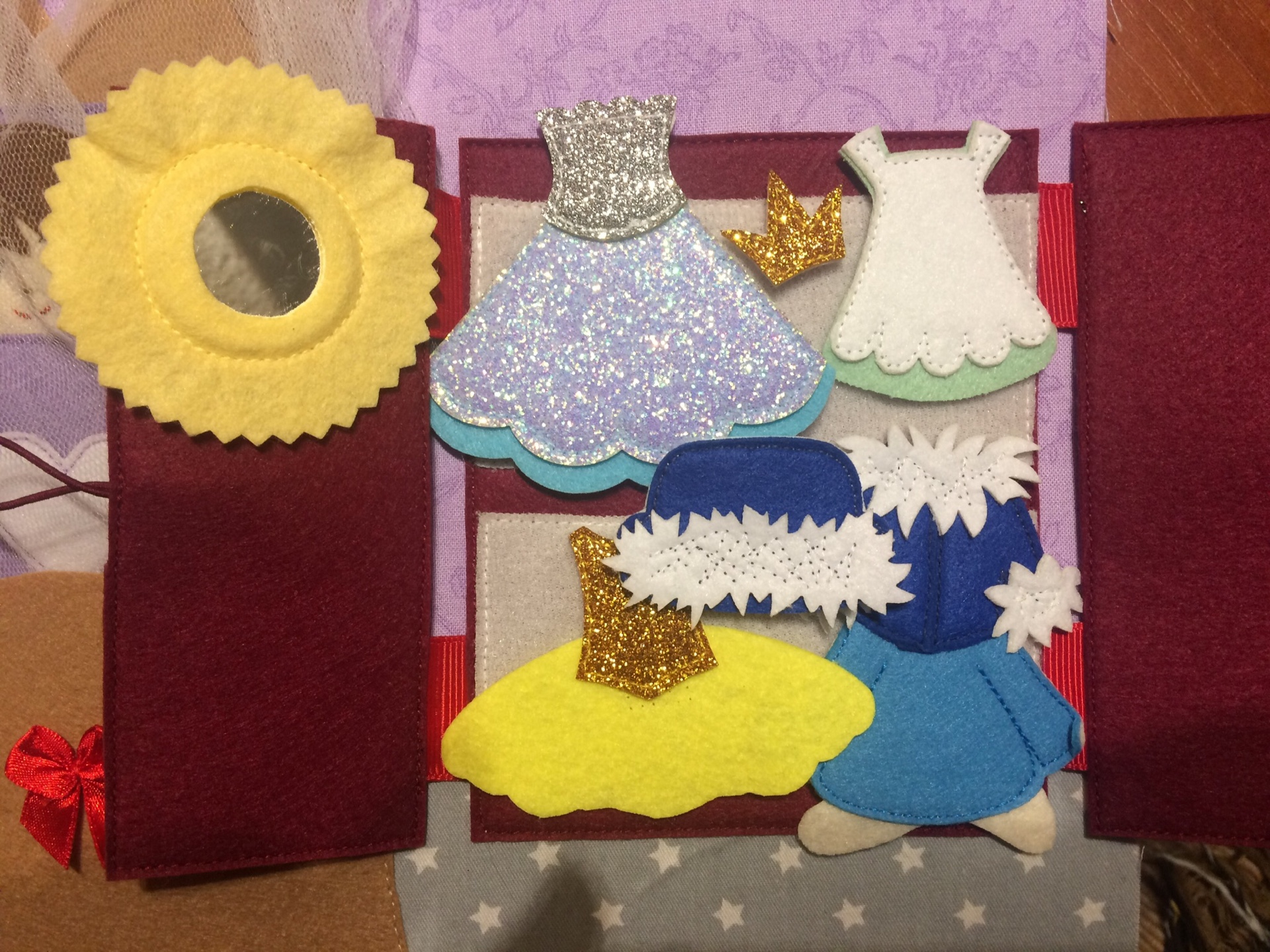 Очень порадовало наличие золотой ниточки в наборе, она как раз подошла для пошива золотого фетра для платья куколки.
