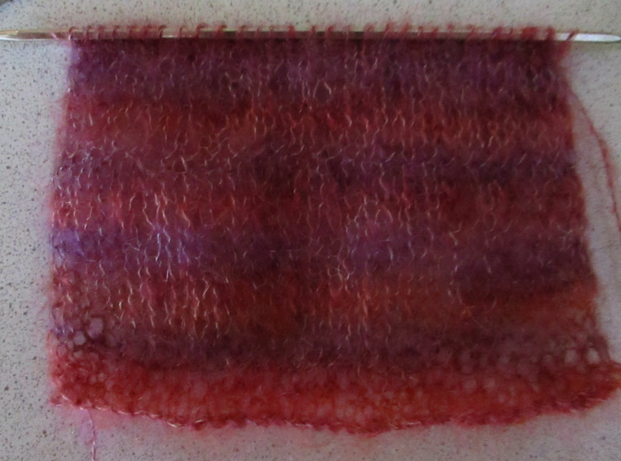 Пряжа неоднотонная, переходы идут от почти сливового до красно-оранжевого, секции довольно короткие. Полный переход мне показался около 5 метров, т.е. в большом изделии будет смотреться как меланж.