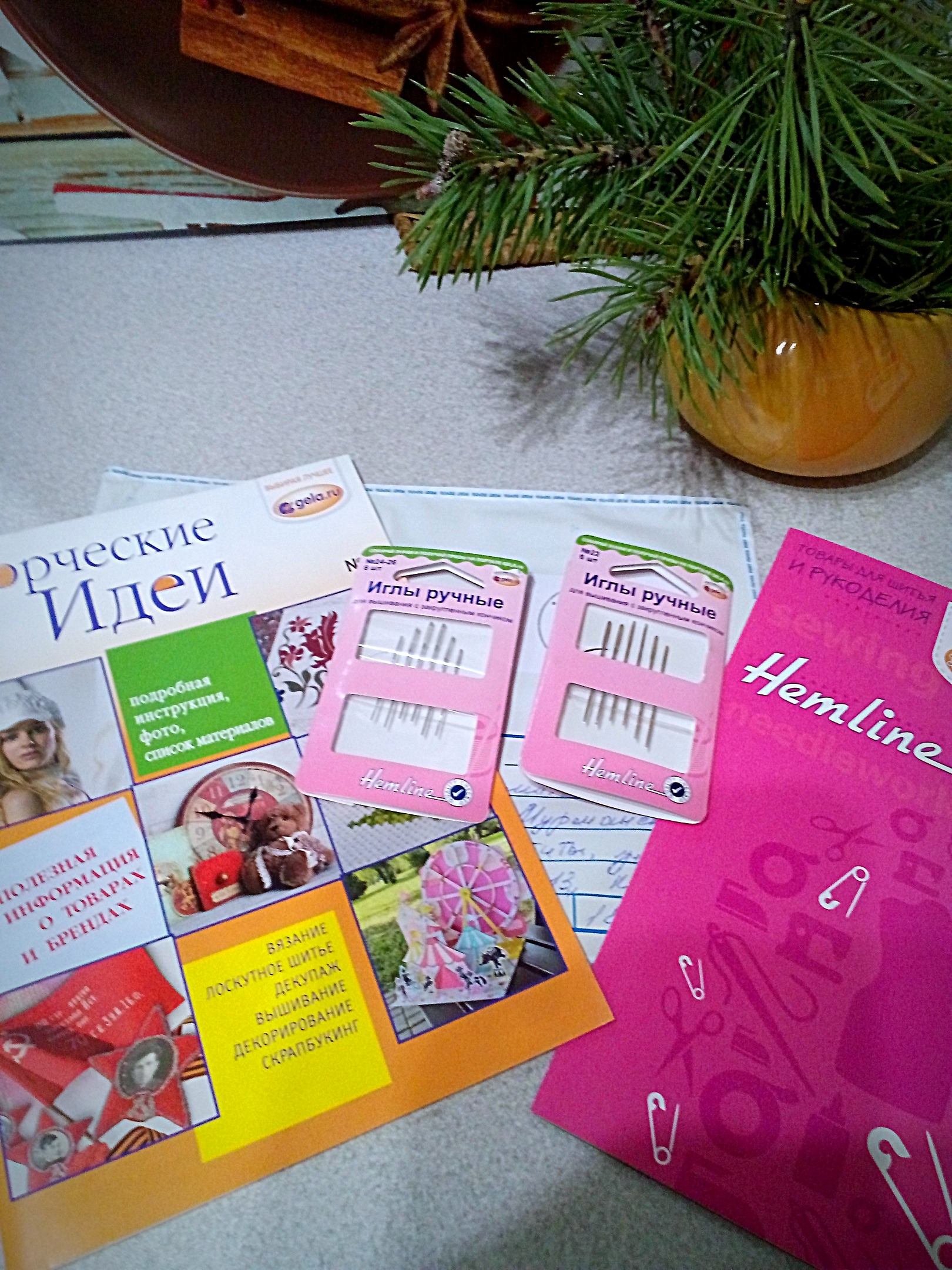 Как всегда, посылочка пришла с журнальчиком" Творческие идеи №4" и маленьким буклетом с рекламой новинок. Я осталась очень довольна новыми иголочками - гладкие, прочные, с большими ушками. Можно вышивать нитками мулине, лентами и пряжей. Иглы №24-26 более тонкие и меньшего размера. Но ушко достаточно большое и не толстое. Кончик у иголок закруглен. На первый взгляд кажется, что они тупые. Но ткань прокалывают настолько легко, что работать одно удовольствие. Качество отличное!