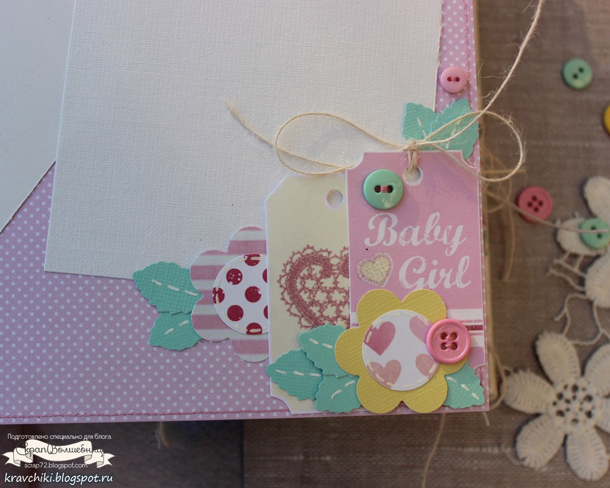 В работе в дополнение к самым маленьким розовым пуговичкам неизвестного мне производителя я использовала набор пуговичек "Пастель" от "Favorite Findings" арт. 550000421 Этот наборчик мне очень понравился - пуговички отличного качества! Большой плюс - в наборе пуговички разного размера, а это очень важно, так как пуговицы одного размера в работе смотрятся скучно, отсутствует динамика. Приятные пастельные цвета отлично подходят для изделий детской тематики и так мило смотрятся на страничках моего альбома! Как я уже писала выше, качеством этого набора я полностью довольна, и согласитесь, работать с качественными товарами вдвойне приятнее!