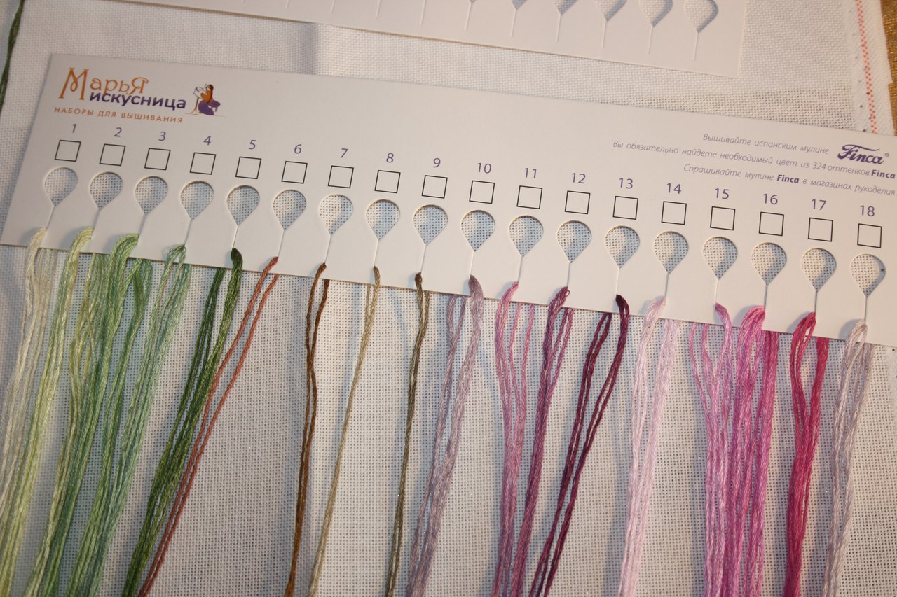 Набор был укомплектован мулине FINCA, Линдой27 от zweigart, иголочкой Hemline. Схема в наборе на двух листах формата А3 - черно-белая, достаточно мелкая. Нет отдельной схемы с бэком. Линии бэка частенько перекрывают символы крестиков, что неудобно. В ключе к схеме допущено 2 ошибки: вместо шва "полукрест", указан "назад иголку" и несовпадение одного значка - значок, присутствующий в ключе отсутствует на схеме. Попадается пара похожих значков - в начале работы из за этого путалась, к концу привыкла, не критично. Значок французского узелка, как и бэк - может перекрыть символ крестика. В ключе не указано, во сколько сложений нитей и во сколько оборотов выполнять французские узелки.