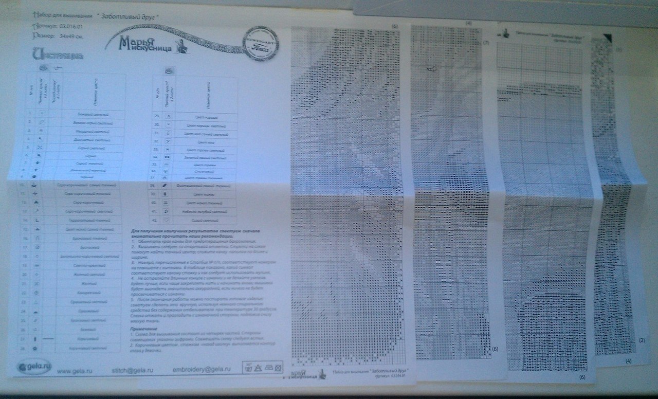 Вышивать я буду набор от Марьи Искусницы "Заботливый друг" арт. 03.016.01. Это довольно большая работа 34*49 и в ней будет использоваться 42 цвета. В набор входит достаточно плотная канва и крупная черно-белая схема на четырех листах формата А3.
