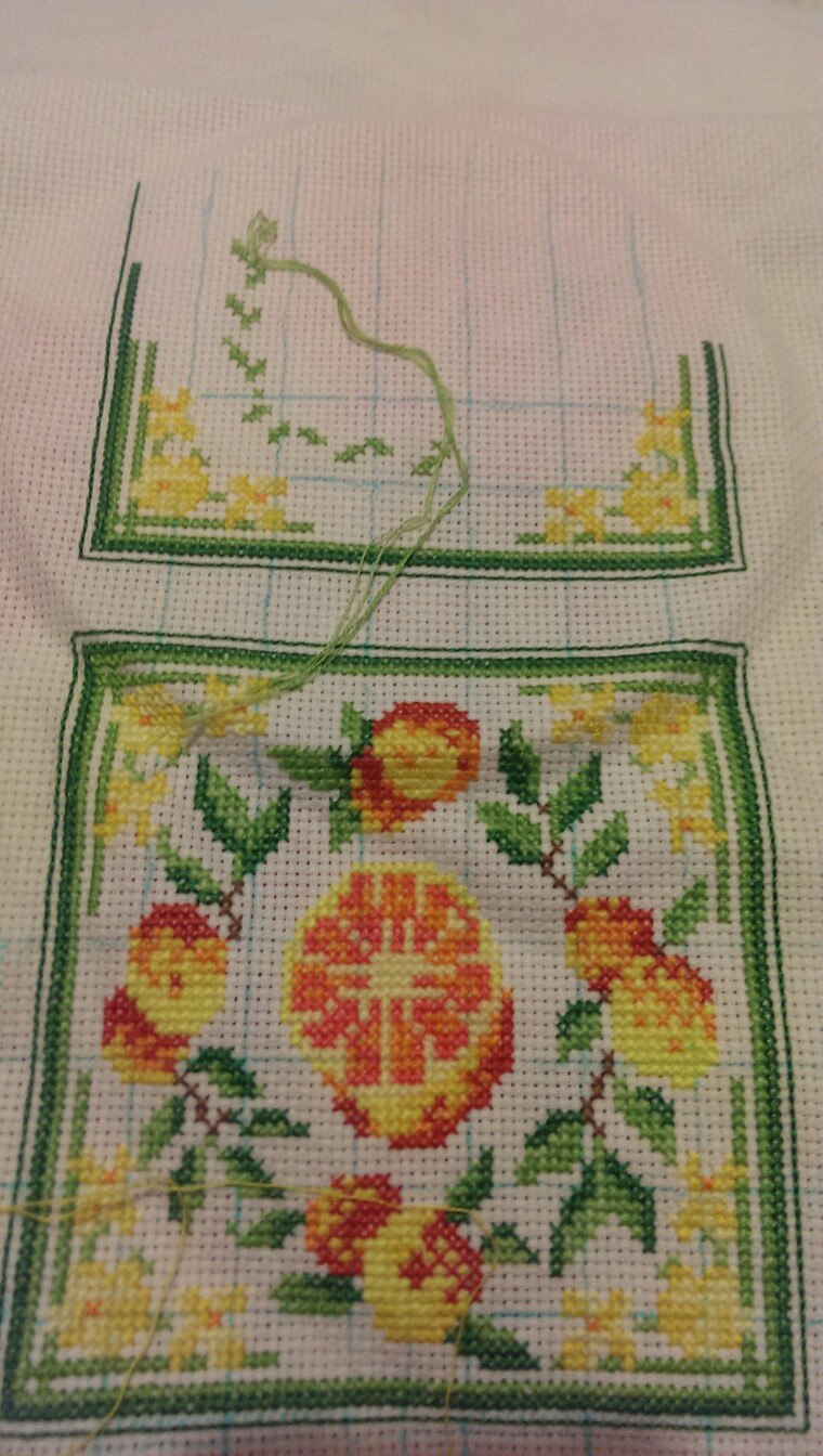 Вышивалось легко и радостно, пока я не поняла, что мне не хватает ниток. И вообще ниточек зеленых оттенков (2 цвета из 3) и ниточек канареечного цвета (цветочки в уголках и на апельсинах) положено впритык, если ошибешься и распорешь. то может и не хватить. Стало грустно. В итоге работа не закончена, надо искать ниточки, чтобы завершить начатое.