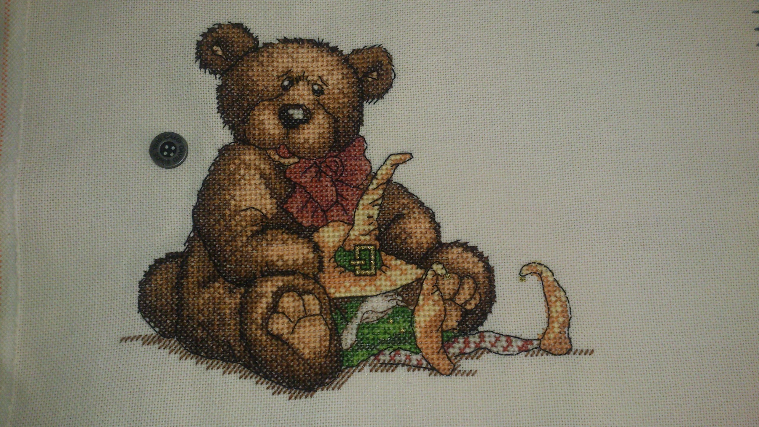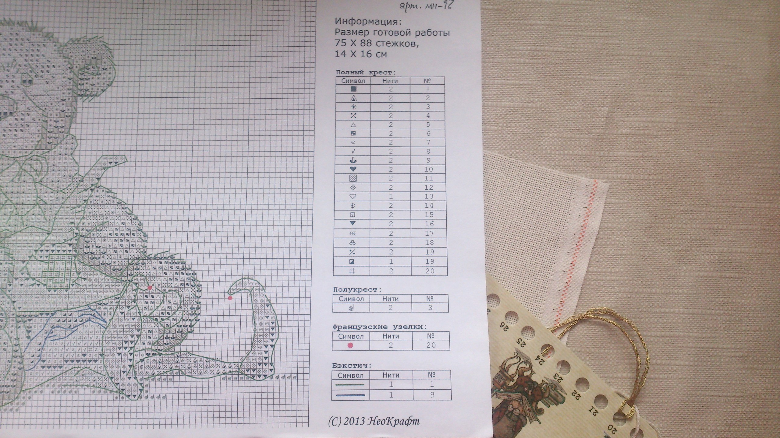 Я начинаю вышивать всегда с нижнего левого угла и эта работа была не исключением. Вышила очень быстро, работа легкая и интересная. По схеме вышивать нужно в две и одну нить, что я и делала. Результатом довольна, ниток осталось достаточно, но крейник потрачен весь. Вышивается эта работа крестом, полу крестом, есть французские узелки и конечно же бэк.