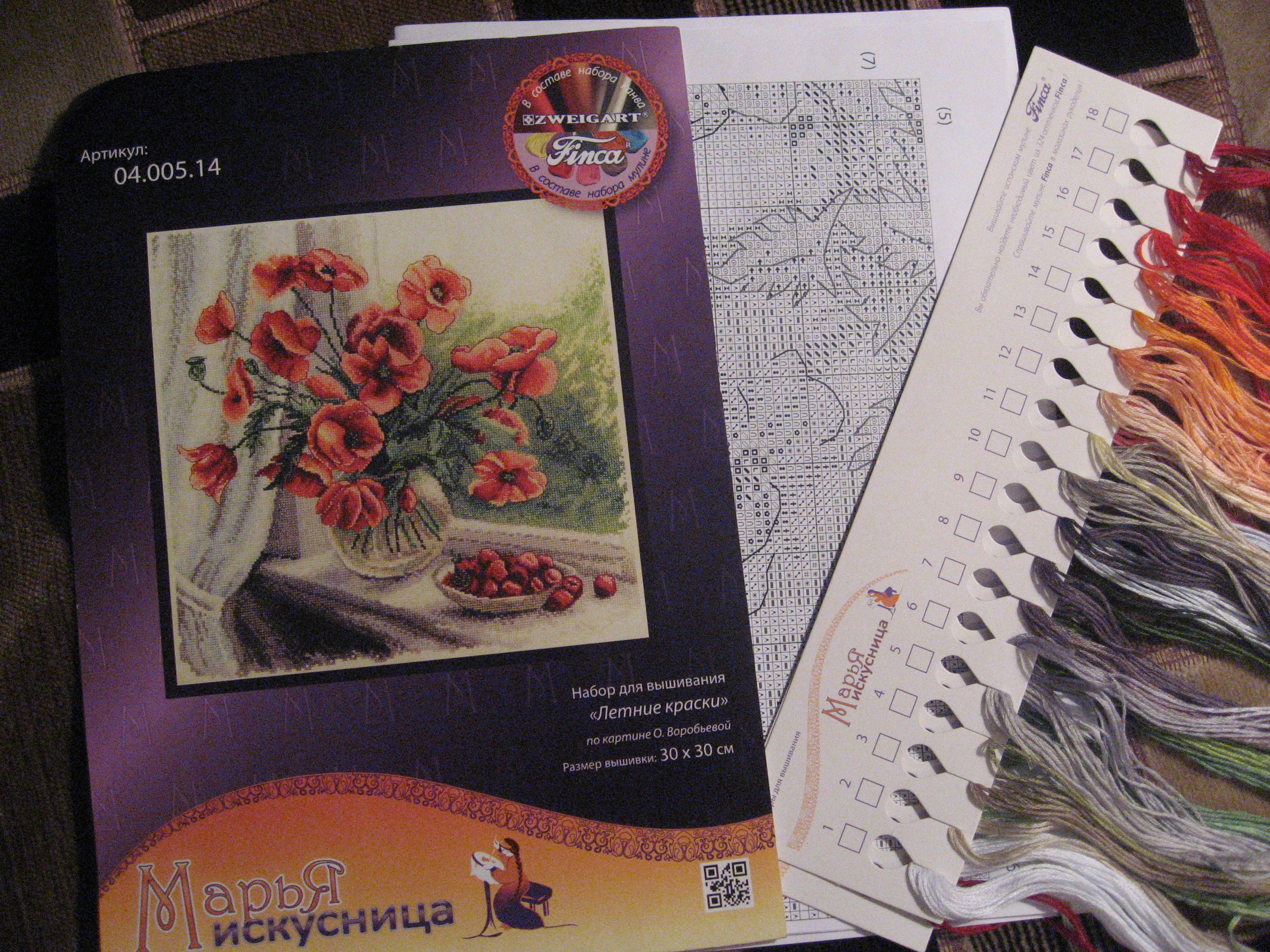 Мне очень нравится дизайн этого набора, яркие красные маки, напоминающие о теплых летних днях. Вот именно с них я и начала новую работу и первое знакомство с данным производителем)