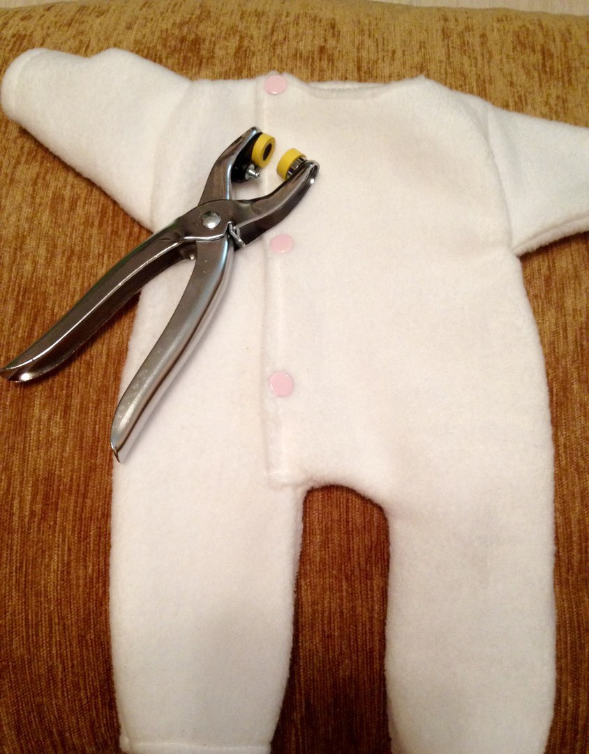 Твёрдый верх "мамы" кнопки и кольцо "папы" чуть больше резинового кольца на шипцах и если приложить кнопку и поднять щипцы, чтобы приложить к ткани - кнопка падает. Поэтому её удобнее прикладывать сначала на ткань, потом прикладывать сверху щипцы, а затем уже зажимать. Но это несложно, щипцы хорошо закрепляют кнопочку. Здесь проблема скорее с кнопками, точнее с размером кнопок (пробовала потом неоригинальную кнопку - отлично входит/выходит в отверстие на щипцах и хорошо крепится к ткани).