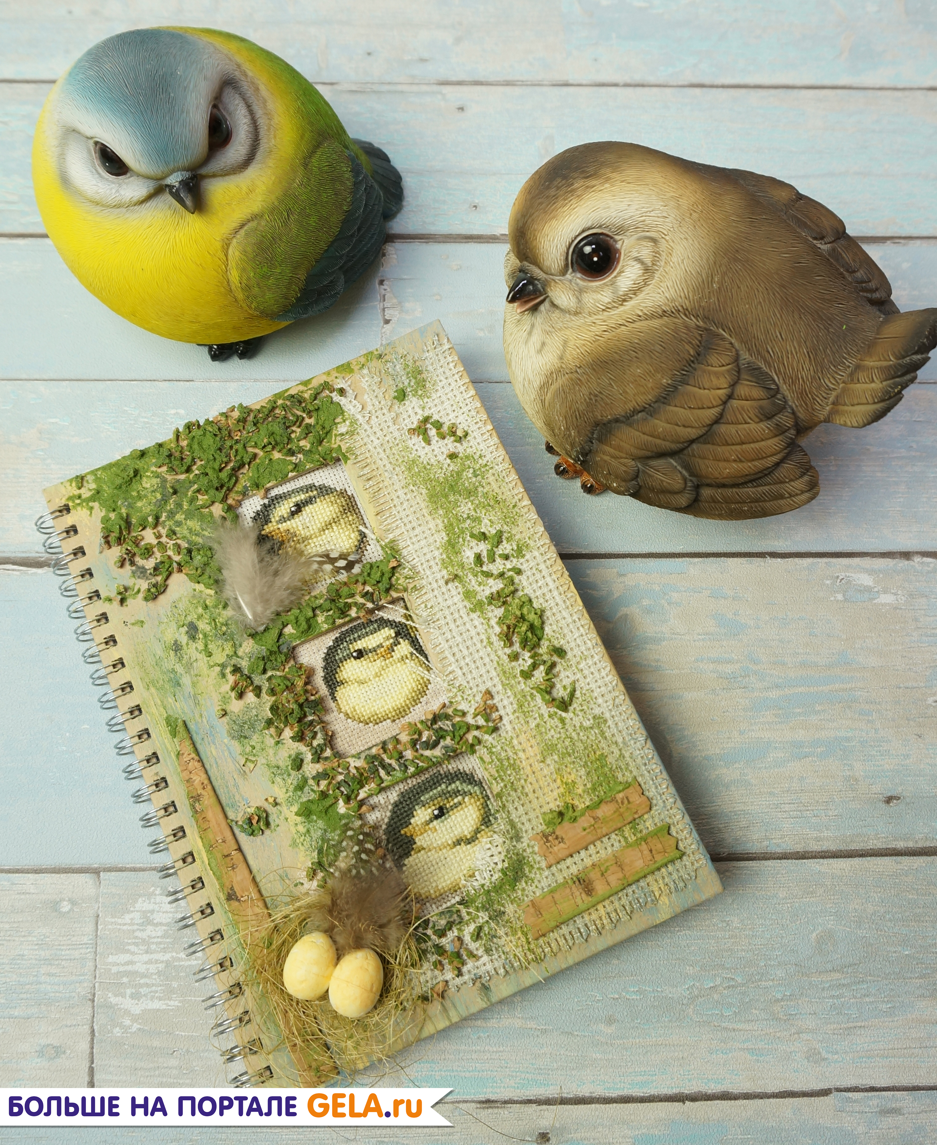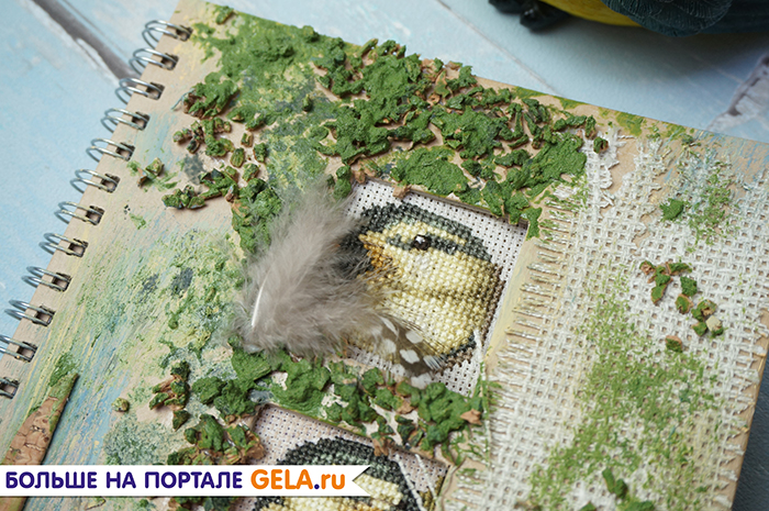 Шаг 6. В декор обложки добавляем перья, сизаль и пенопластовые яйца.