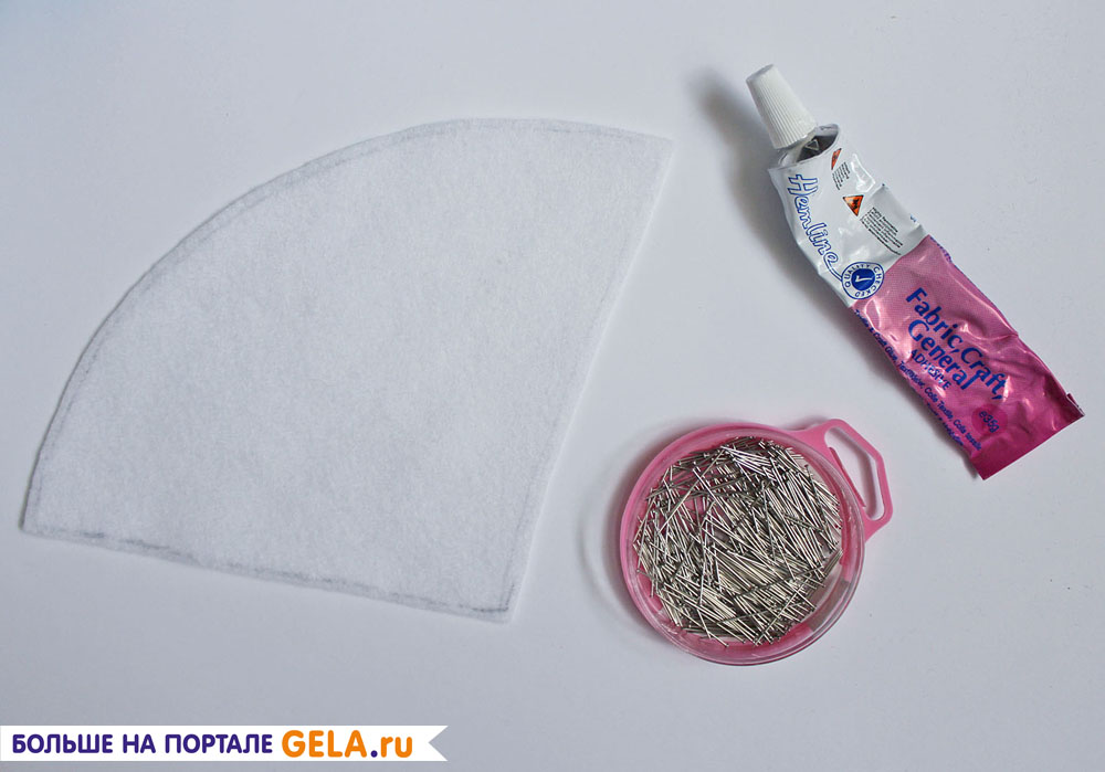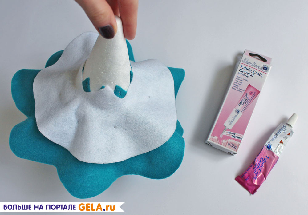 Создаем вторую юбочку. Из белого войлока вырезаем круг диаметром 20 см. и в центре делаем 2 надсечки (не более 4 см). Одеваем юбочку на конус. Создаем красивую драпировку,ивременно закалываем ее булавками. Если, получившаяся драпировка нравится, вытаскиваем булавки и закрепляем все текстильным клеем. Аккуратно наносим клей на части войлока, которые должны прилегать к первой юбочке и плотно прижимаем.