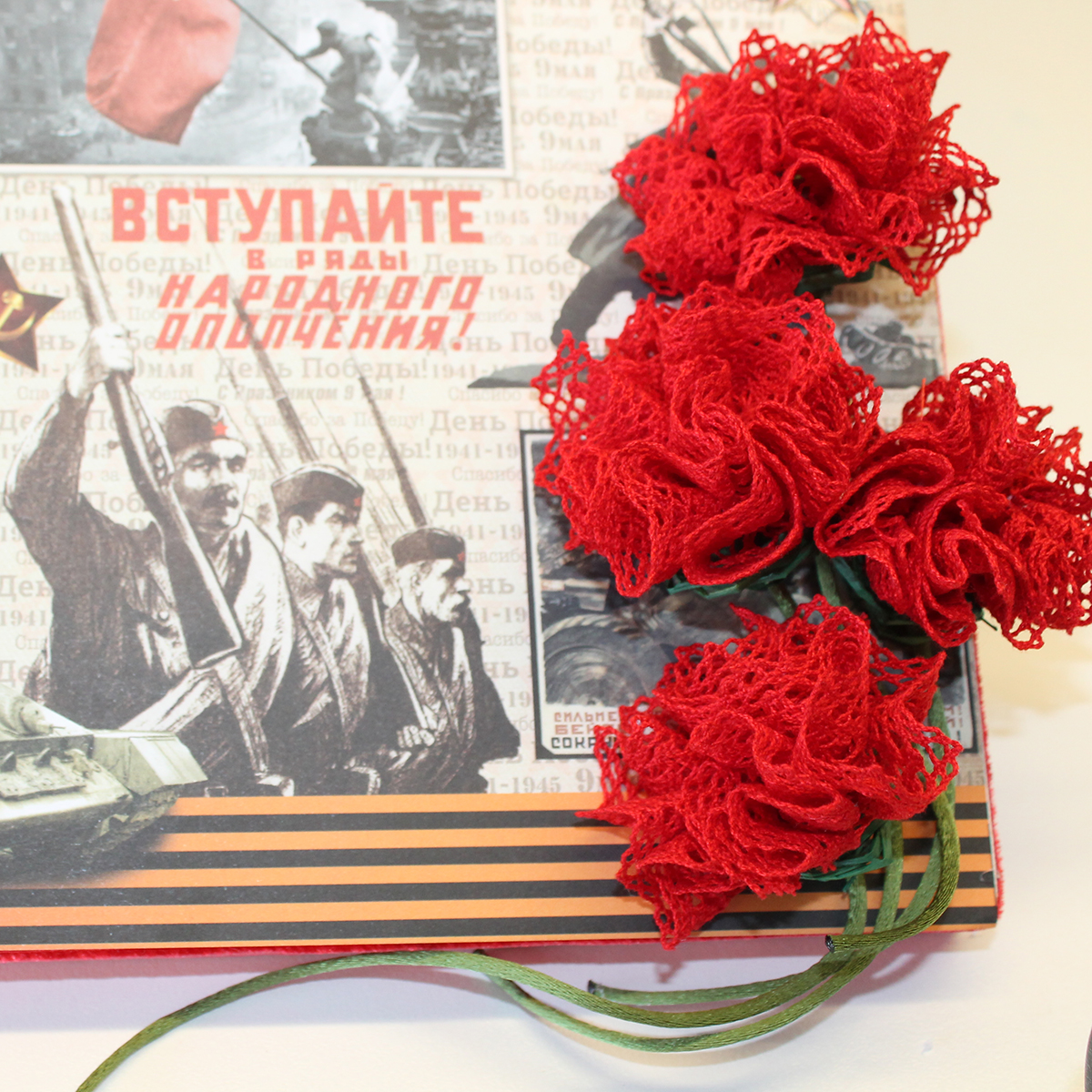 12. Делаем гвоздики из кружева. Два отрезка длиной 30 см стягиваем и склеиваем вместе.