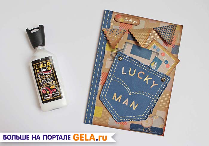 Шаг 12. Кармашек дополняем надписями, используя стикеры из набора Geometric Kraft и золотыми брадсами в виде шурупов.