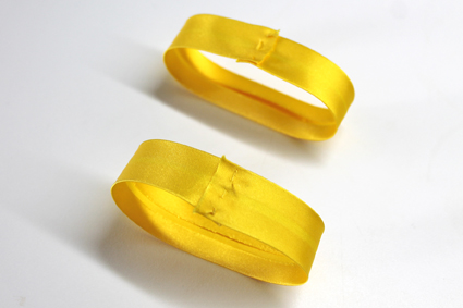 1. Сделайте два отрезка атласной косой бейки и 1 отрезок жаккардовой ленты длиной по 15 см каждый.