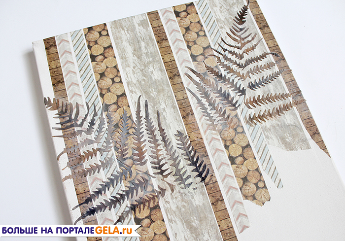 Укладываем несколько листьев папоротника под второй слой бумаги и приклеиваем. Второй слой бумаги (самый крупный лист с изображением деревянных спилов) обязательно приклеиваем на картонную подложку (не менее 4-5 мм), для того, чтобы придать работе больший объем. Картон к обратной стороне клеим меньше листа примерно на 1 см (чтобы он не выглядывал по бокам). Клеим второй слой бумаги+ картон к холсту с помощью клеящего пистолета. Правый край и нижнюю часть бумаги плотно приклеиваем к холсту, чтобы из-под бумаги не выглядывал толстый слой картона. Третий слой бумаги (небольшой лист с изображением деревянных спилов) также клеим на картонную подложку не менее 4-5 мм, но к холсту пока не клеим.