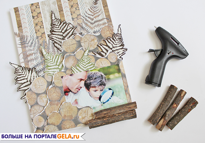 Выбираем фотографию с любимыми мужчинами на природе и приклеиваем ее на понравившееся место ко второму слою бумаги. Сверху клеим третий слой бумаги на картонной подложке.
