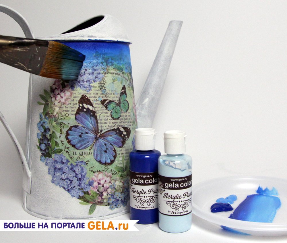 Воспользуйтесь двумя светыми голубыми оттенками. Так же смешайте краски на кисти и прокрасьте центр лейки. Если краска попадает на мотив, сотрите ее влажной салфеткой. Просушите краску.