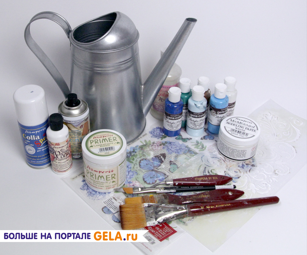 Перед работой обезжирьте поверхность лейки. Покройте ровным слоем грунтом-спреем для сложных поверхностей Stamperia. Оставьте лейку просохнуть.С помощью такой грунтовки вы получите надежную основу для дальнейшего декора.