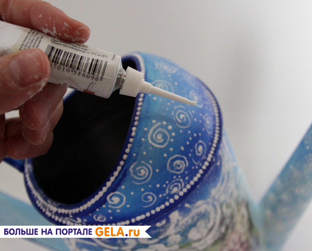 С помощью белого контура дополните декор лейки завитушками и горошками. Просушите контур.