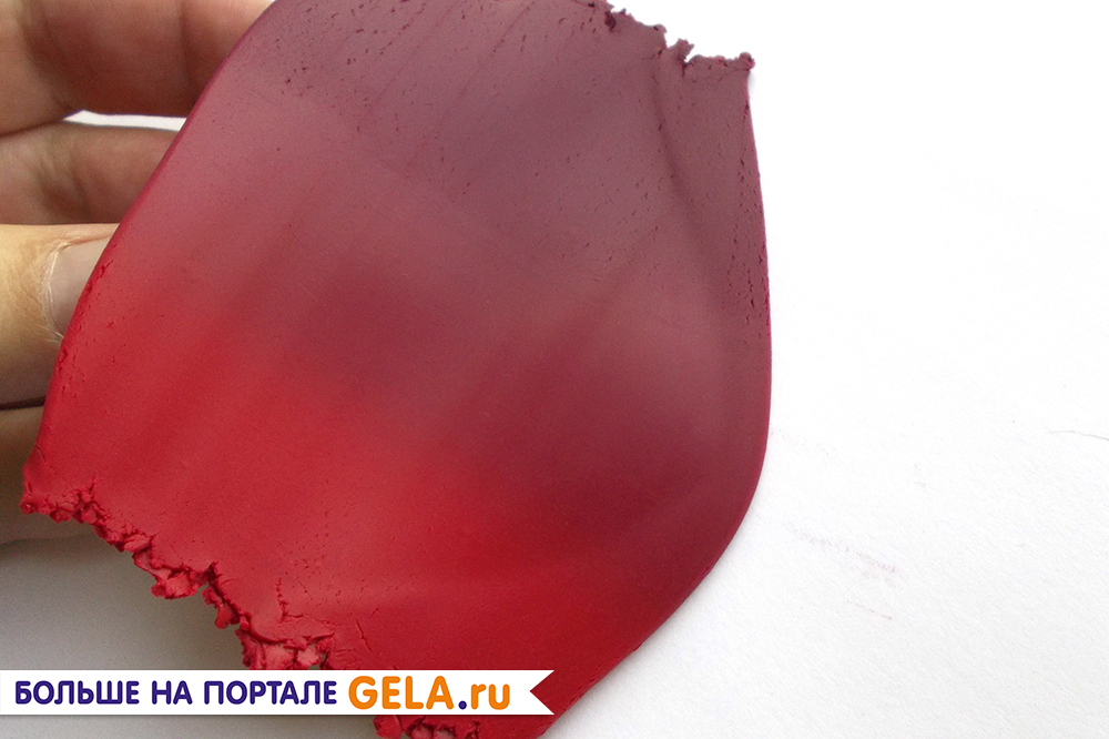 Шаг 1. Для начала займемся листьями. Хорошо разминаем глину, формируем из нее жгутик и отрезаем от него максимально одинаковые кусочки. Пальцами придаем им форму капельки и отпечатываем текстуру с помощью молда. Вместо него можно воспользоваться свежим листом или просто нанести прожилки иглой или зубочисткой. Не забываем в широкой части листа проделать зубочисткой отверстие для сборки.