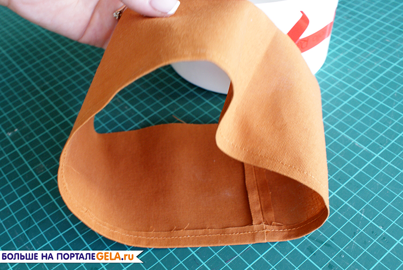 16. Надеваем получившуюся тканевую «трубу» на крышку, совмещая нижний край борта с подогнутым краем ткани. Можно в нескольких местах зафиксировать край ткани клеем «Момент Кристалл». На верхнем припуске делаем надсечки, приклеиваем припуск к верху крышки.