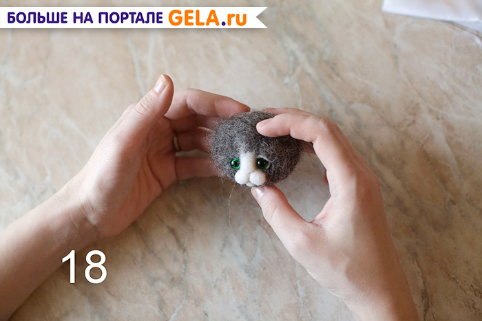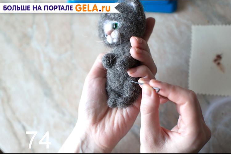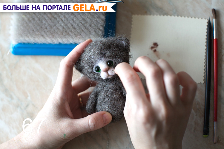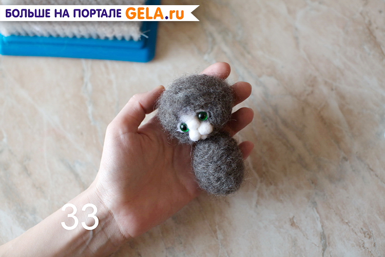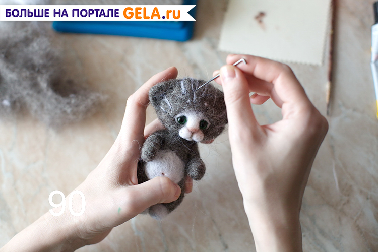 Шаг 89. Начинаем приваливать достаточно глубоко средней иглой полоски. После этого ,Котенка обрабатываем обратной иглой по всей поверхности. И приклеиваем глазки, капая по капельке клея на петельки, также можно пришить иголкой глазки. И место выхода иголки затем привалять шерсткой.