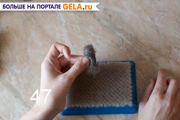 Шаг 36. На щетке проходим грубой иглой с двух сторон несколько раз, формируя плотные ушки.