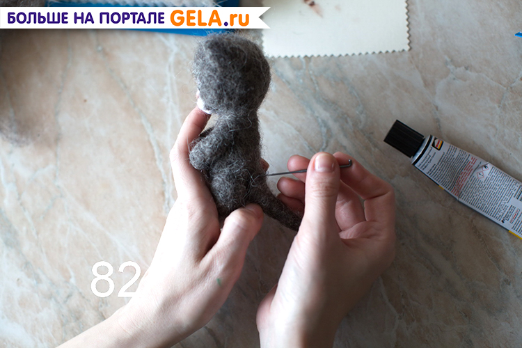 Шаг 75. Берем кусочки шерсти и фиксируем ножки.