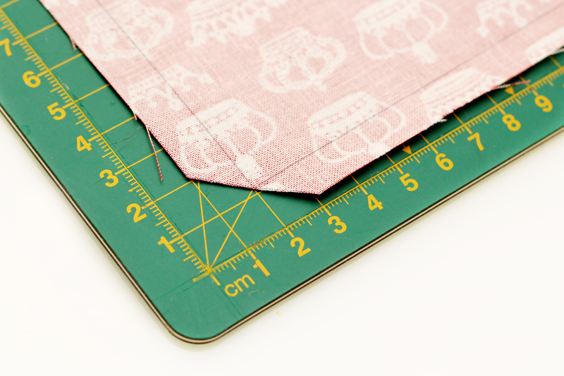 Шаг 3. Пришиваем к флагу с одной из широких сторон косую бейку. Из ткани основного цвета вырезаем деталь размером 28х50 см, обрезаем уголки, что бы ровнее загнуть края и заутюживаем 1 см на изнанку. Пришиваем к ней флаг, как карман.