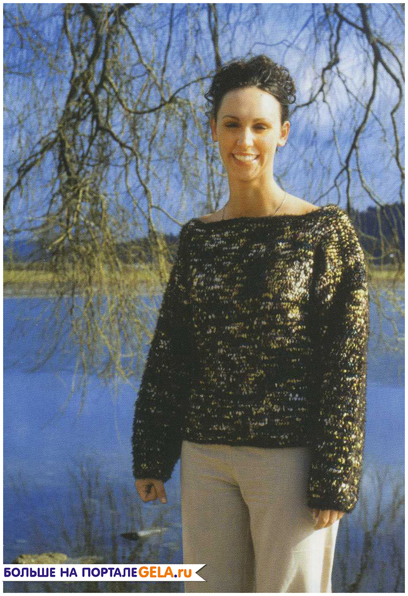 В обе спицы для ткачества продеть нить Gala, цвет 16. Пуловер вязать лиц. гладью пряжей Venezia цвет 3.