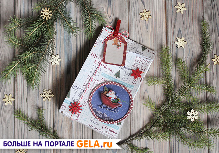 Шаг 15. Из набора бумаги Jolly Santa собираем 3D картинку и завязываем на кончике шнура.
