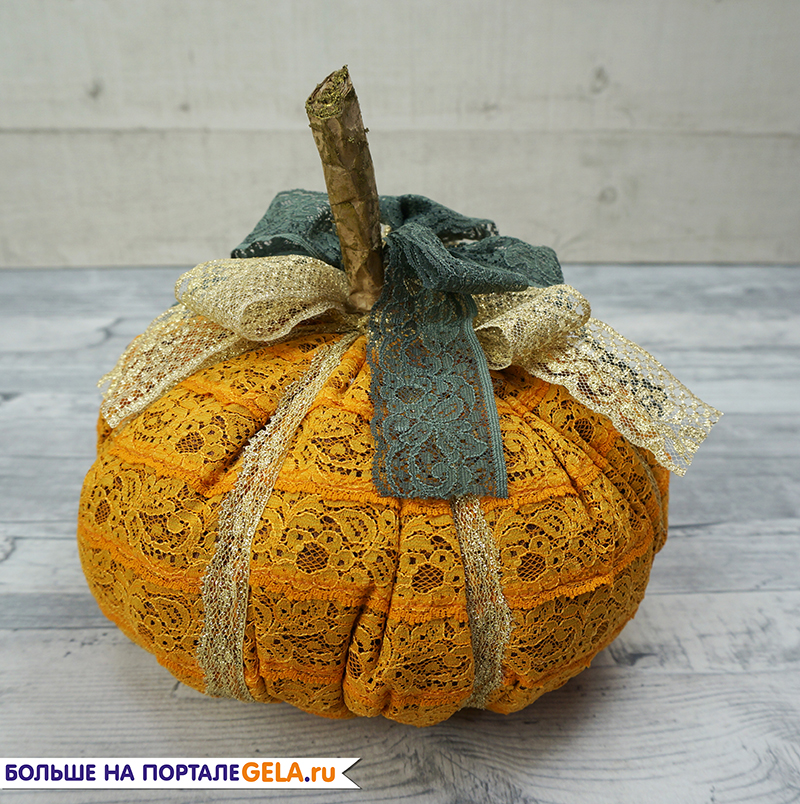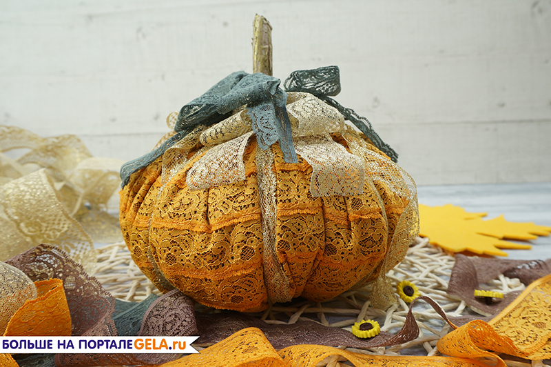 4. Тонким золотым кружевом обвязываем тыкву, деля ее на дольки.